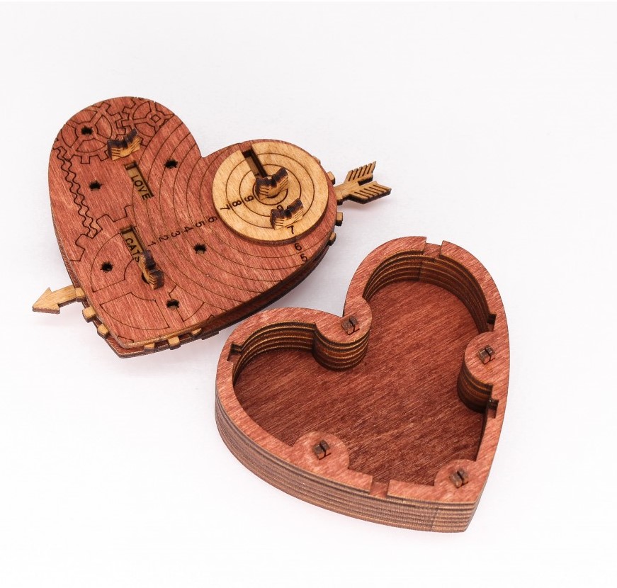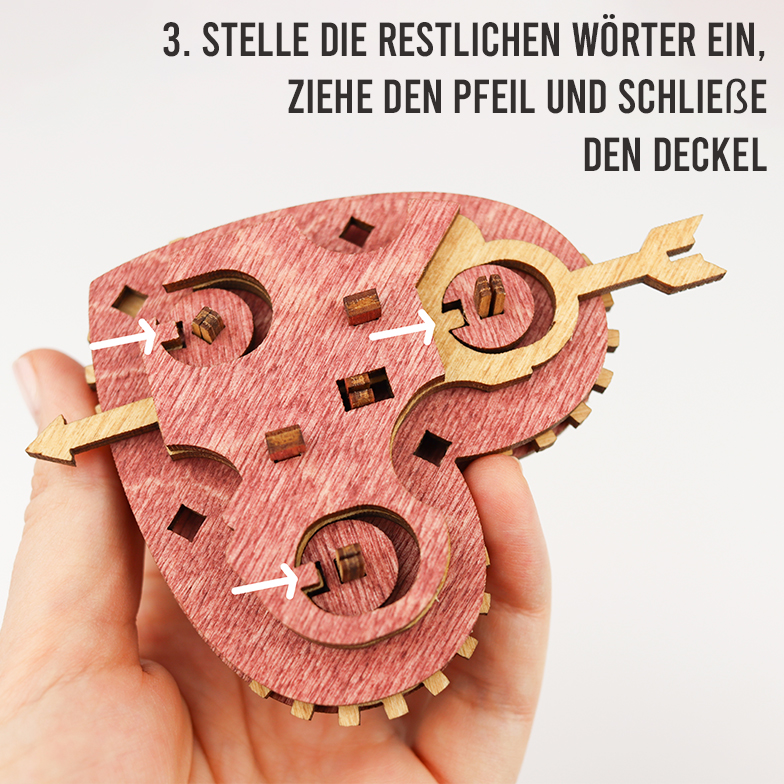 Tin Woodman's Heart ist eine mechanische Holzkiste mit einem anpassbaren Codeschloss. Der Code besteht aus drei Wörtern und aus den vorgegebenen Optionen können Sie die Kombination wählen, die Ihnen am besten gefällt. Sie können es romantisch halten und den Schlüssel auf I LOVE YOU oder TAKE MY HEART setzen oder Sie können ihn auf eine lustige Botschaft wie I LOVE BEER setzen. Es gibt 8 Wörter auf jedem der drei Zahnräder und mehr als 50 mögliche Kombinationen. Das Herz von Tin Woodman ist ein tolles Geschenk, das auch als raffinierte Geschenkverpackung verwendet werden kann!