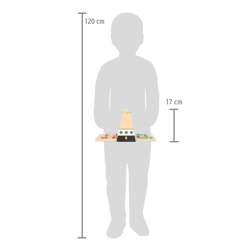 Maße: Spielbrett ca. 33 x 17 x 17 cm, Schiff ca. 6 x 1 x 0,5 cm
