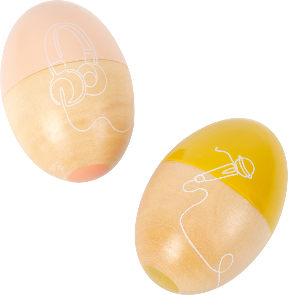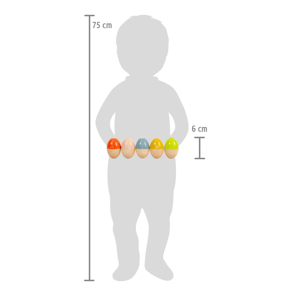 Schütteln, rasseln, musizieren: Mit diesen Musik- und Rasseleiern gibt’s was auf die Ohren! Jedes der fünf Schütteleier aus robustem Vollholz macht ein anderes Geräusch und sorgt für jede Menge Rhythmik-Spaß. Die formschönen Eier lassen sich von Kinderhänden besonders gut greifen. Und auch optisch sind die Musikeier mit ihrer Kombination aus naturbelassenem Holz und modernen Kontrastfarben ein Hingucker für die Kinderzimmer-Band!