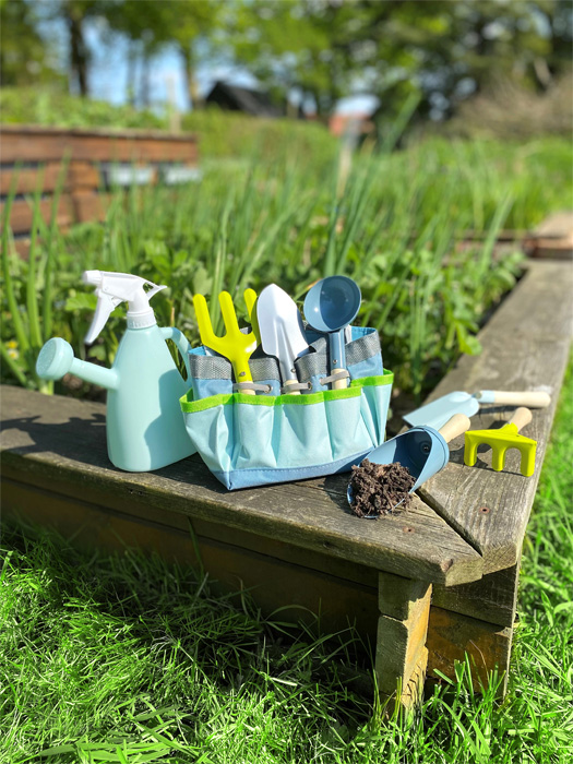 Die sechs unterschiedlich geformten Handwerkzeuge aus robustem Metall in Trendfarben sind mit ihren naturbelassenen Holzgriffen echte Hingucker für die Buddelausstattung! Mehl- und Kohleschaufel, Handspaten und Schöpfkelle sowie kleine Harke und Grabegabel können in der Tasche problemlos verstaut werden und sind so immer griffbereit. Perfekt ergänzt wird das Gartenset durch die 2-in-1 Sprühflasche, die auch eine Gießkanne ist!