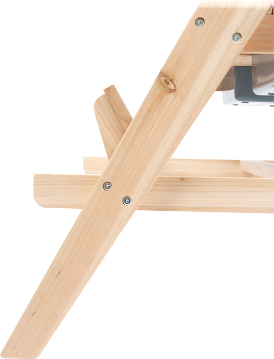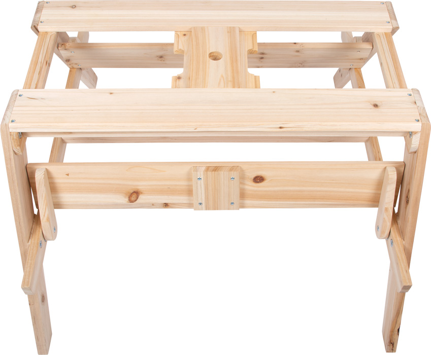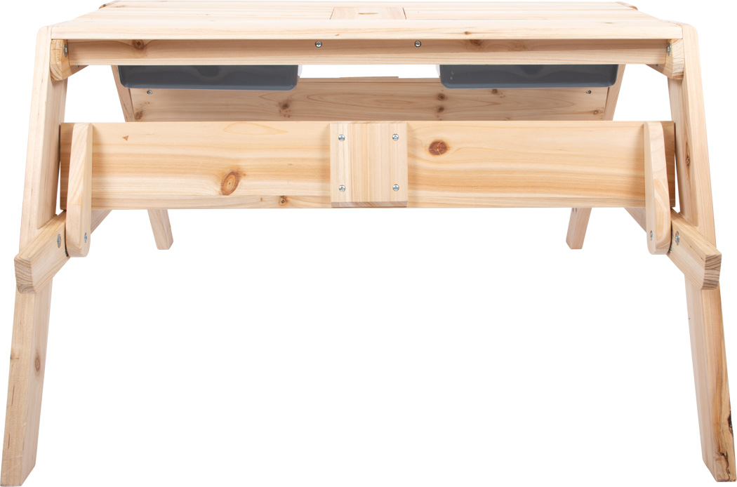 Die Sitzbankflächen können hochgeklappt werden, so dass sie vor Witterung geschützt sind und Kinder auch im Stehen am Tisch spielen können. Eine pfiffige, multifunktionale Kindersitzgarnitur, die neben ihrer Funktion als Matschtisch auch als Picknicktisch oder zum Malen und Basteln genutzt werden kann. Die Aussparungen im Bereich der Kunststoffwannen erleichtern das Herausnehmen der Wannen und in dem Loch in der Mitte der Tischfläche kann ein eigener geeigneter Sonnenschirm Platz finden, um Schatten zu spenden. Ausgestellte Beine sorgen für einen sicheren Stand, das hochwertige Holz garantiert eine lange Lebensdauer. Das ist wichtig, denn ein Matschtisch animiert Kinder über einen langen Zeitraum immer wieder zu neuen, kreativen Spielideen und zum Experimentieren.