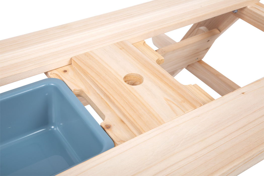 Das Highlight befindet sich im Inneren des Kindertisches – wenn die zwei Tischplatten hochgenommen werden, entsteht eine schöne Fläche zum Spielen! Die zwei herausnehmbaren Matschschüsseln aus robustem Kunststoff sind mit ihrem Fassungsvermögen von je ca. 3 Litern nicht nur zum Matschen hervorragend geeignet, sie dienen auch zum Aufbewahren von Sandspielzeug, zur Bevorratung von Sand, zum Sammeln von Naturmaterialien oder zum Befüllen mit Wasser.