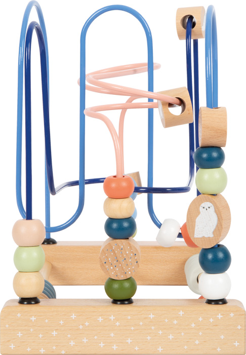 Spielerisch Geschicklichkeit üben. Langanhaltende Beschäftigung bietet dieses Motorikspielzeug aus FSC® 100%-zertifiziertem Holz, bei dem Holzperlen sowie drei mit Eisbär, Robbe und Schneeeule bedruckte Schiebeelemente über die drei farblich passenden und ineinander verschlungenen Metallschleifen geführt werden können.
