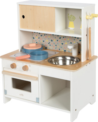 Diese moderne Spielküche in Weiß mit trendiger Terrazzo-Rückwand bringt großen Kochspaß auf kleinem Raum. Trotz ihrer kompakten Maße ist sie bestens ausgestattet: Herd mit drehbaren Klick-Knöpfen, Backofen mit magnetischer Tür, herausnehmbares Spülbecken aus Metall sowie Zubehör bestehend aus Pfanne, Topf mit Deckel und Kochlöffel aus Holz.