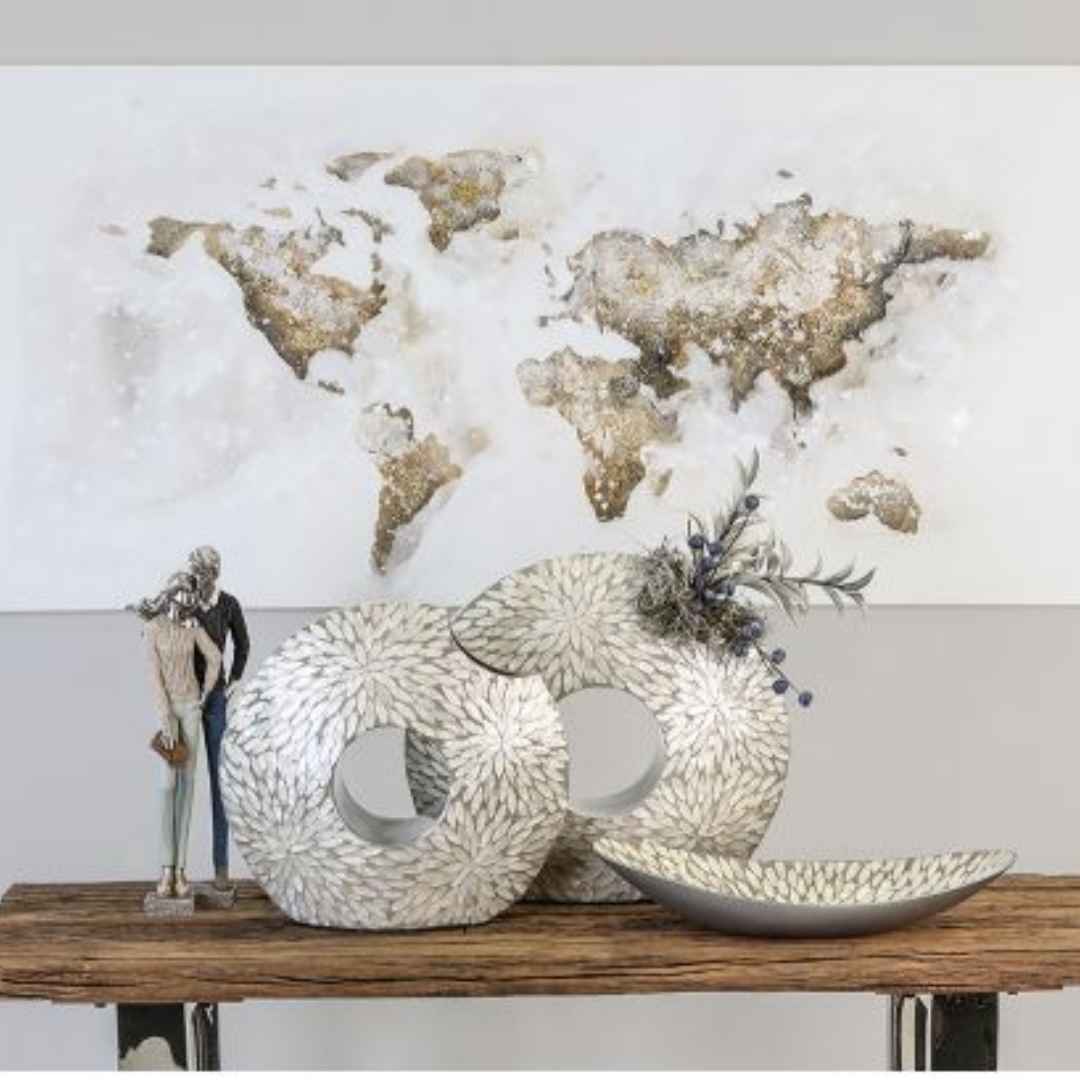 Das Bild - Weltkarte ist ein einzigartiges Wandobjekt. Es ist ein handgearbeitetes Kunstwerk, das jeden Raum aufwertet. Das Bild besteht aus einer Leinwand auf Keilrahmen und ist in verschiedenen Farben wie Braun, Grau, Silberfarben und Weiß gehalten. Diese Farben sind wunderschön miteinander harmoniert und verleihen dem Bild eine besondere Note.