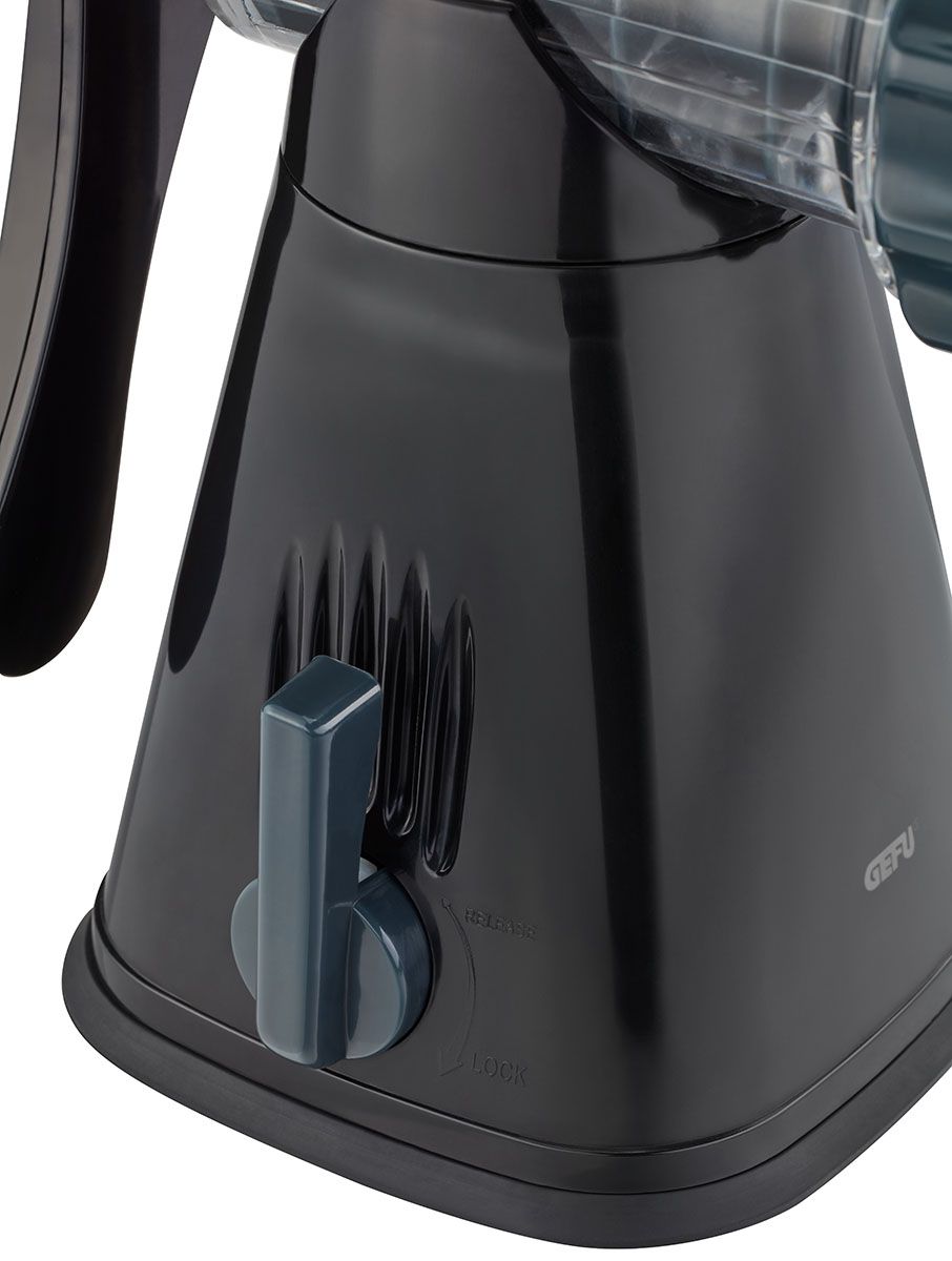 - Handlicher Stößer für sicheres Nachschieben der Lebensmittel