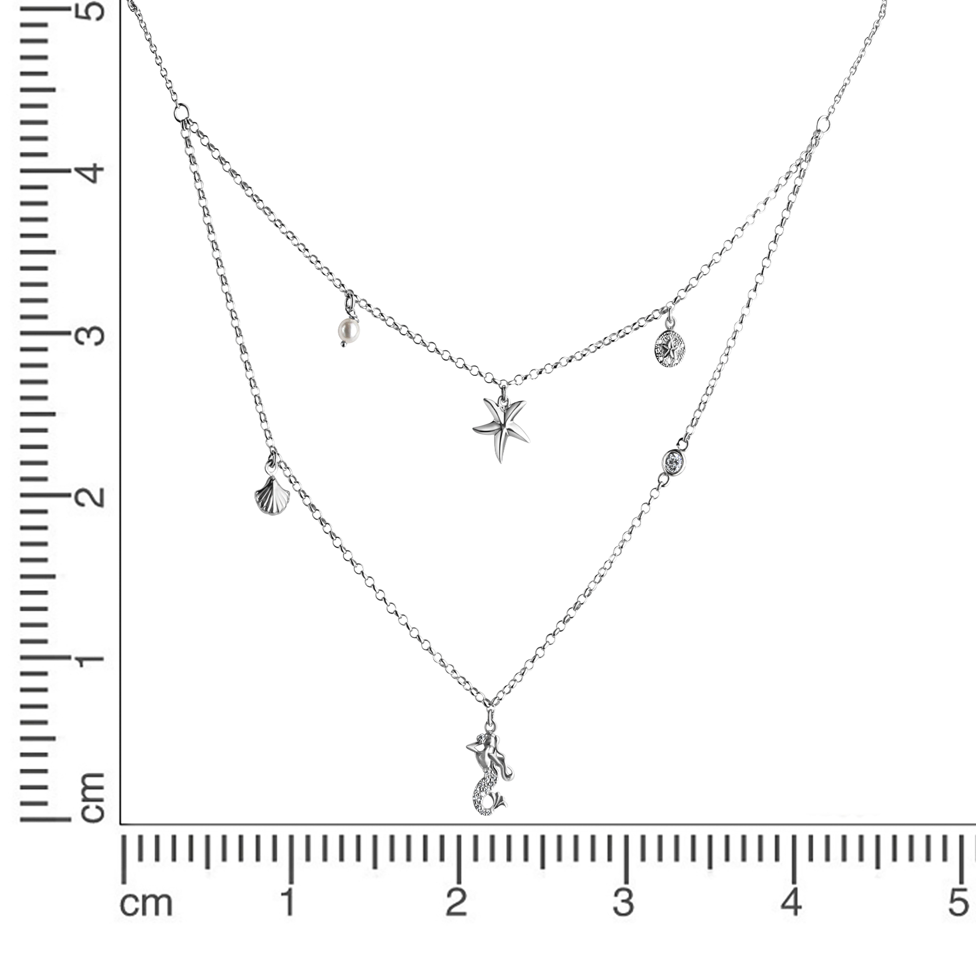 Zweireihige Halskette aus rhodiniertem 925er Sterling Silber mit liebevoll gestalteten maritimen Anhängern. Die filigrane Ankerkette trägt Motive wie Seestern, Muschel, Meerjungfrau und Perle, die das Schmuckstück zu einem sommerlichen Blickfang machen. Die glänzende Oberfläche sorgt für edle Leuchtkraft, während das verspielte Design Leichtigkeit und Urlaubsgefühl vermittelt – ideal für Strandliebhaberinnen oder als originelles Geschenk.