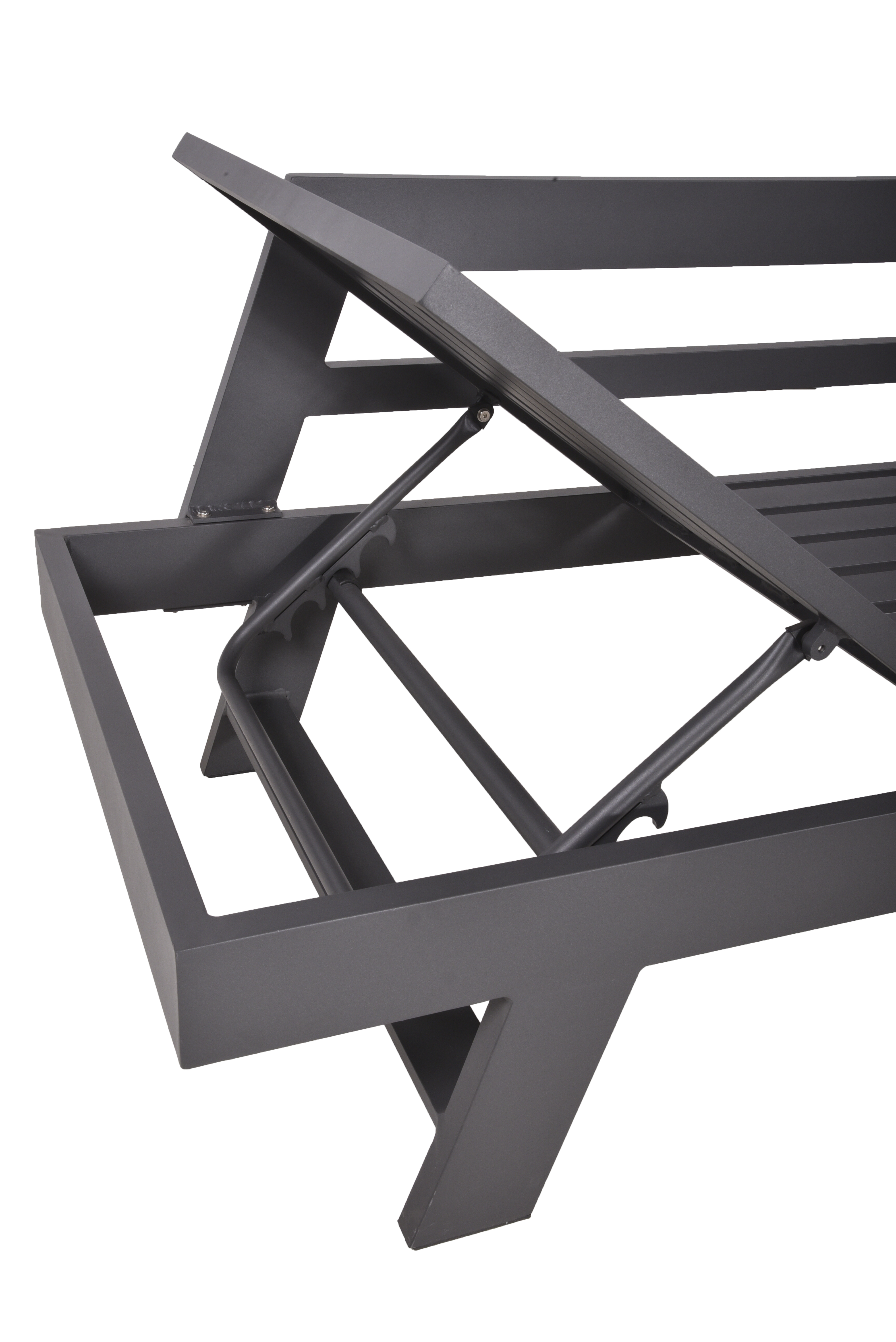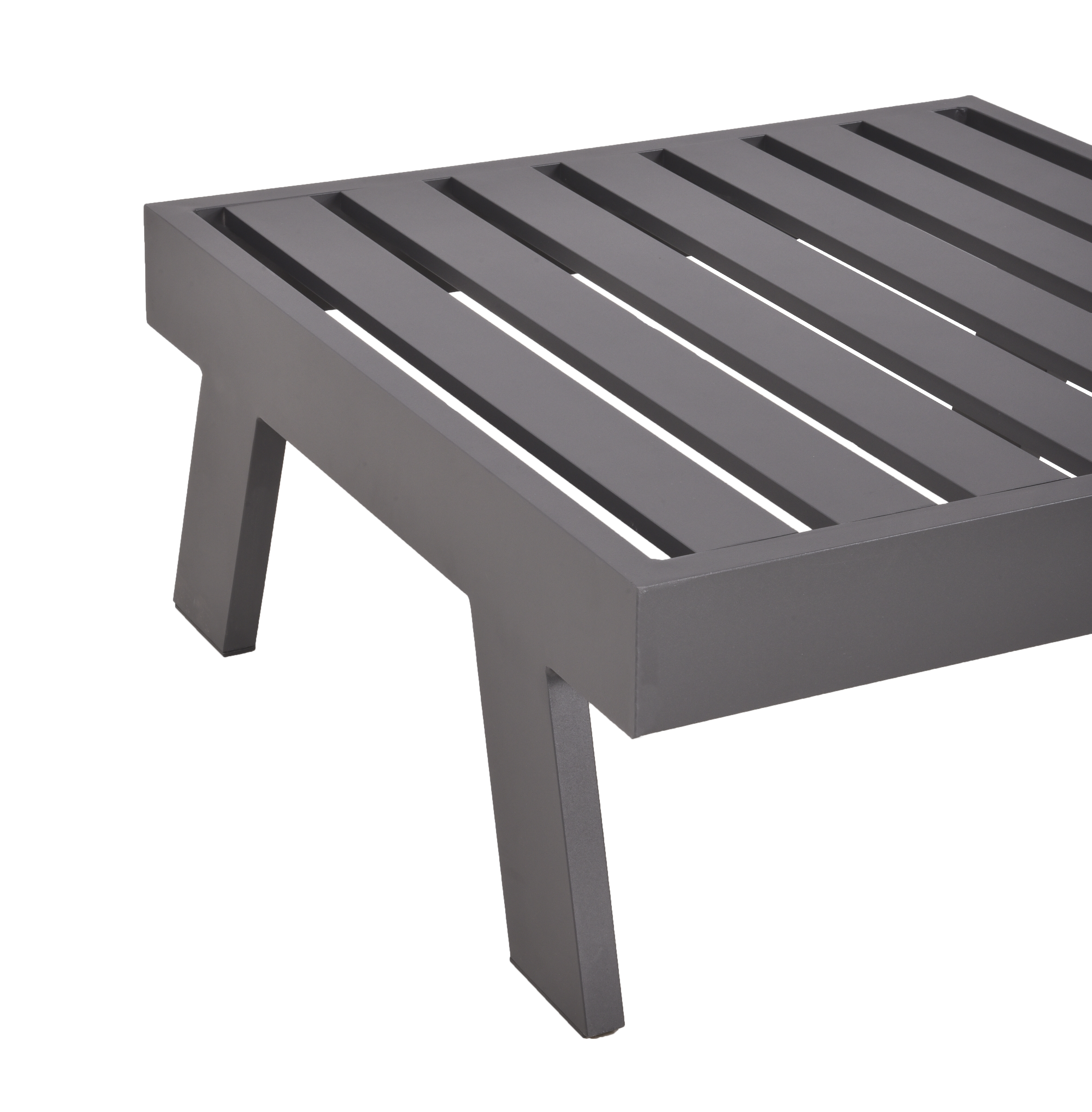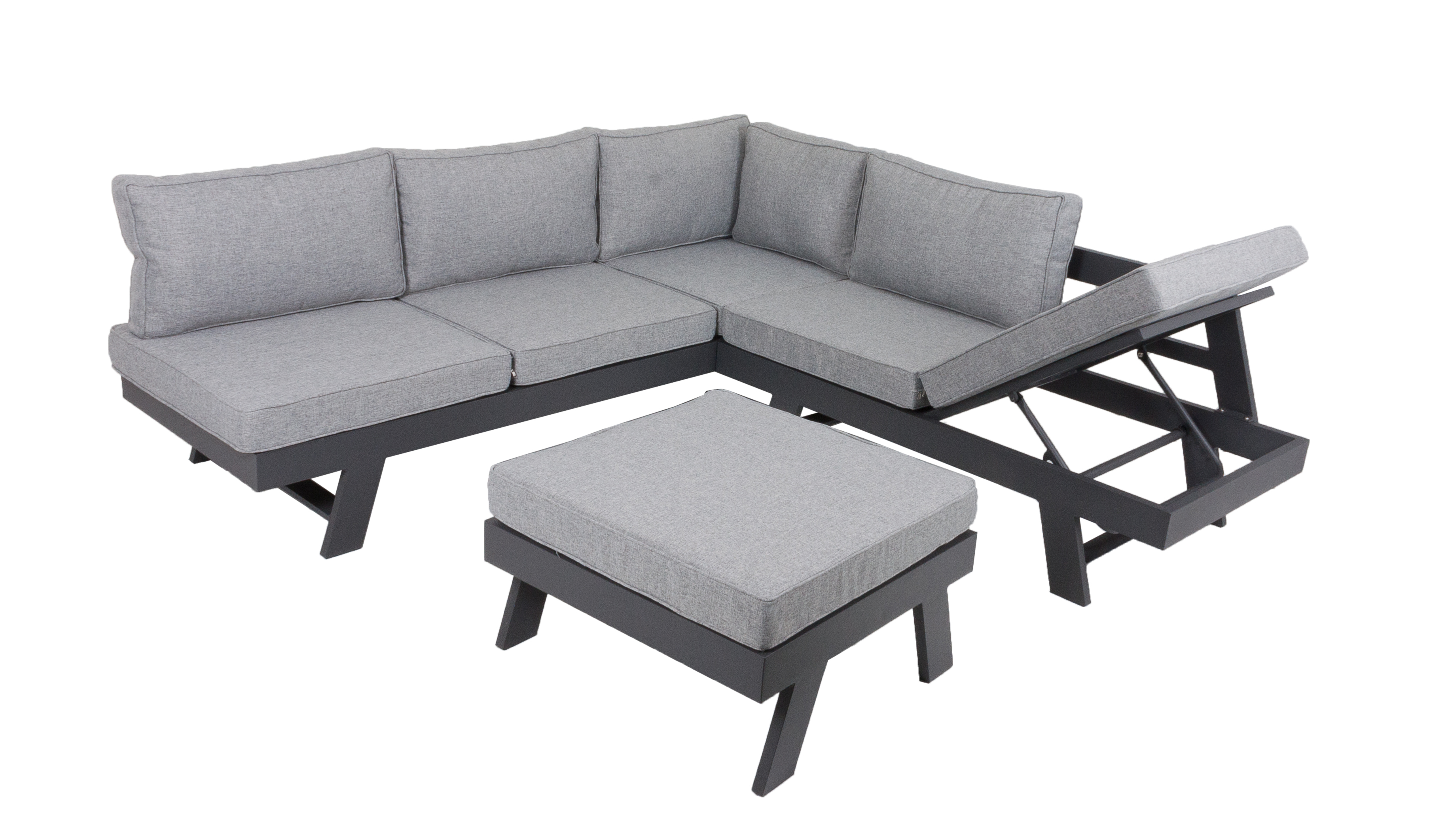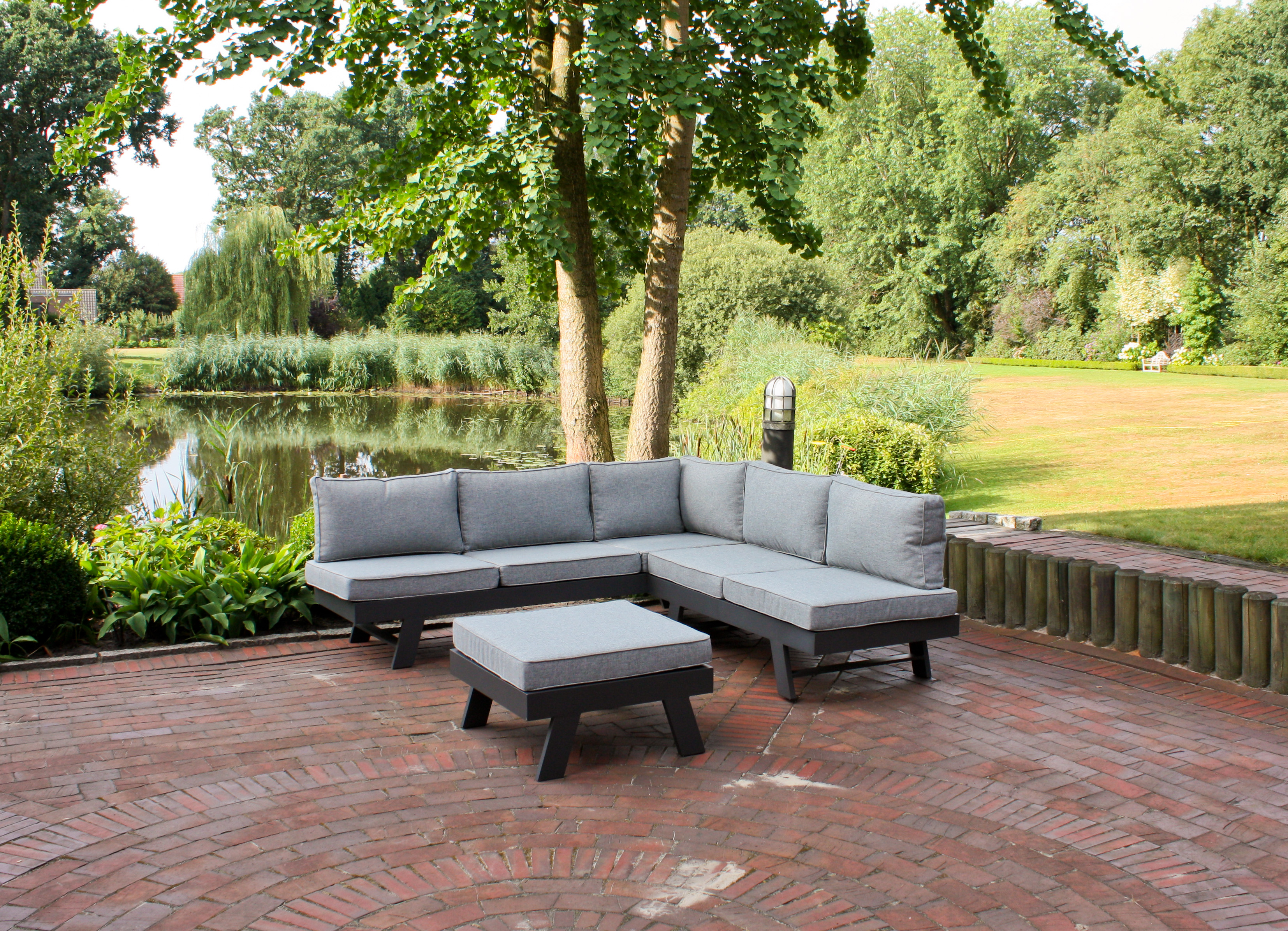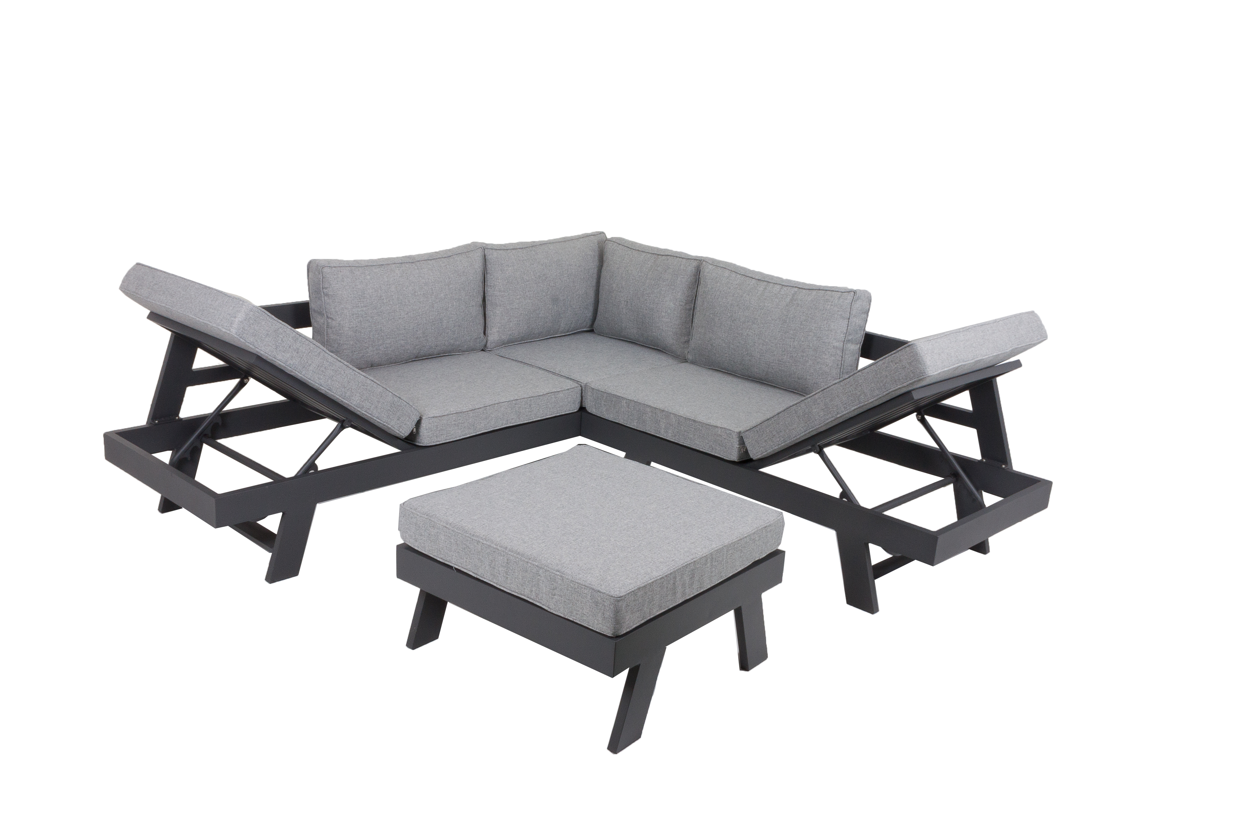 Die Sitz- und Rückenkissen bestehen aus erstklassigem, grauem Polyester und sorgen für höchsten Komfort. Ihr dezenter Grauton setzt einen stilvollen Kontrast zum schwarzen Aluminium und unterstreicht das moderne, elegante Erscheinungsbild des Sets. Die weiche Polsterung lädt zum Entspannen ein und macht das Verweilen im Freien besonders angenehm.