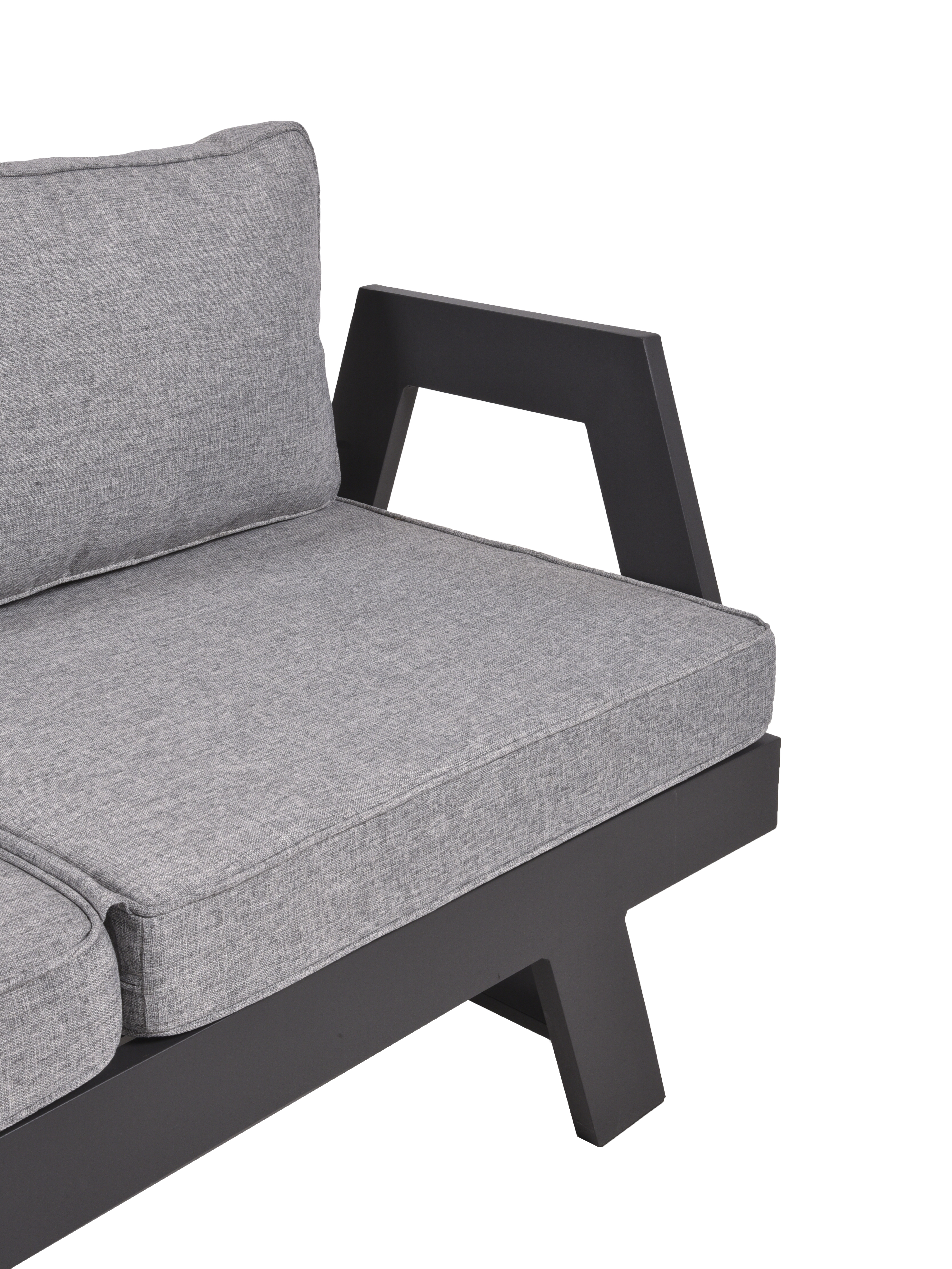 Das Lounge-Set DONNA vereint Exklusivität und modernes Design und verleiht Ihrem Außenbereich eine luxuriöse Note. Es umfasst ein großzügiges 3-Sitzer-Sofa, ein stilvolles 2-Sitzer-Sofa sowie einen passenden Tisch – alle gefertigt aus hochwertigem, meliertem Aluminium in elegantem Schwarz.