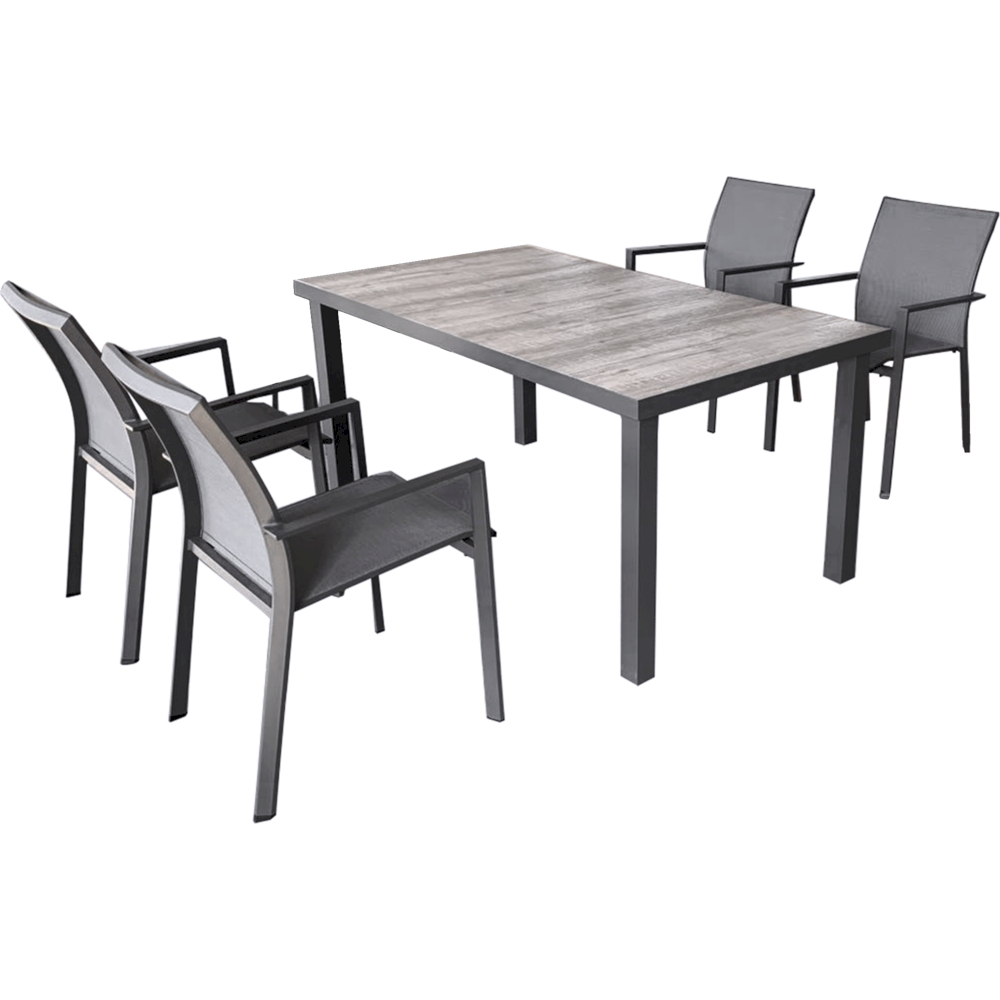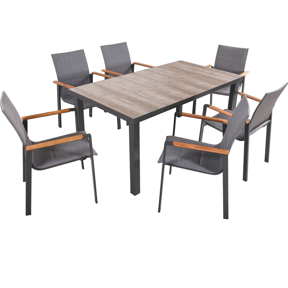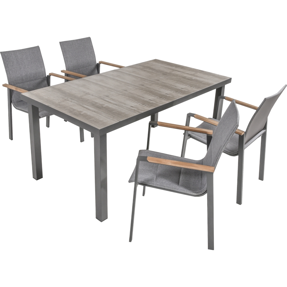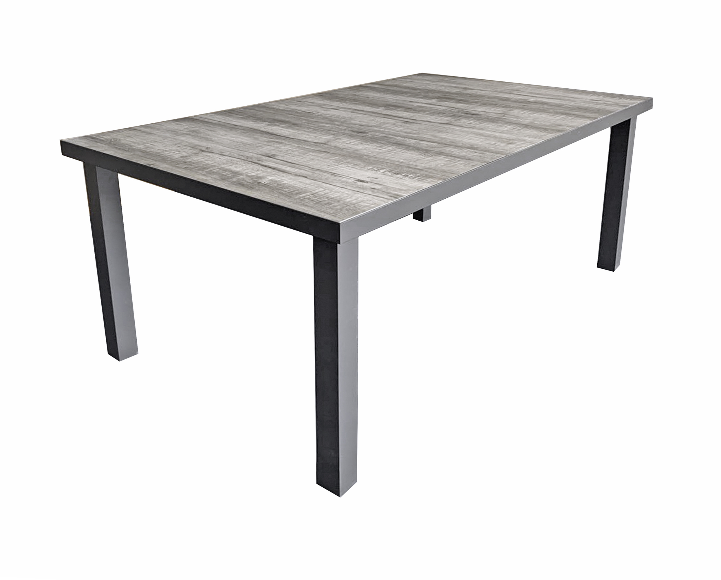 Der Tisch RANA kombiniert ein pulverbeschichtetes Aluminiumgestell in Dunkelgrau mit einer langlebigen Keramik-Tischplatte in Eiche-Optik. Wetterfest, pflegeleicht und vielseitig einsetzbar – ideal für Innen- und Außenbereiche. Die robuste Konstruktion sorgt für Stabilität, das zeitlose Design für stilvolle Akzente.