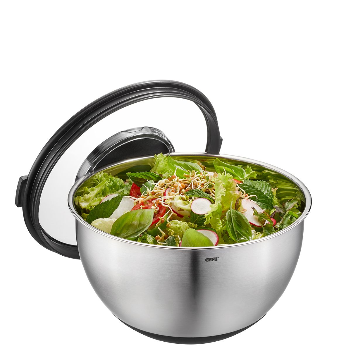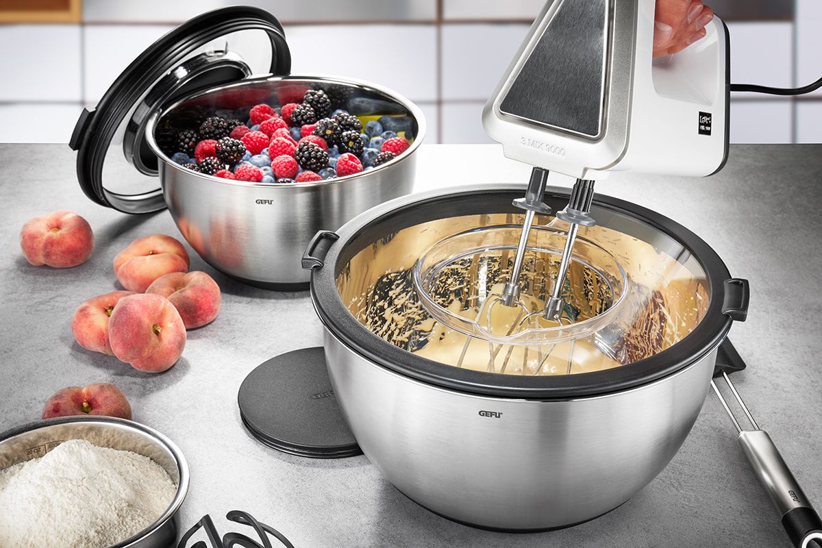 Diese eleganten Schüsseln aus hochwertigem Edelstahl bieten nicht nur Vielseitigkeit und rutschfesten Halt, sondern überzeugen auch mit einem innovativen Spritzschutzdeckel. So bleiben Sahne- und Teigspritzer beim Rühren aus, und das Rührgut bleibt danach wunderbar frisch.