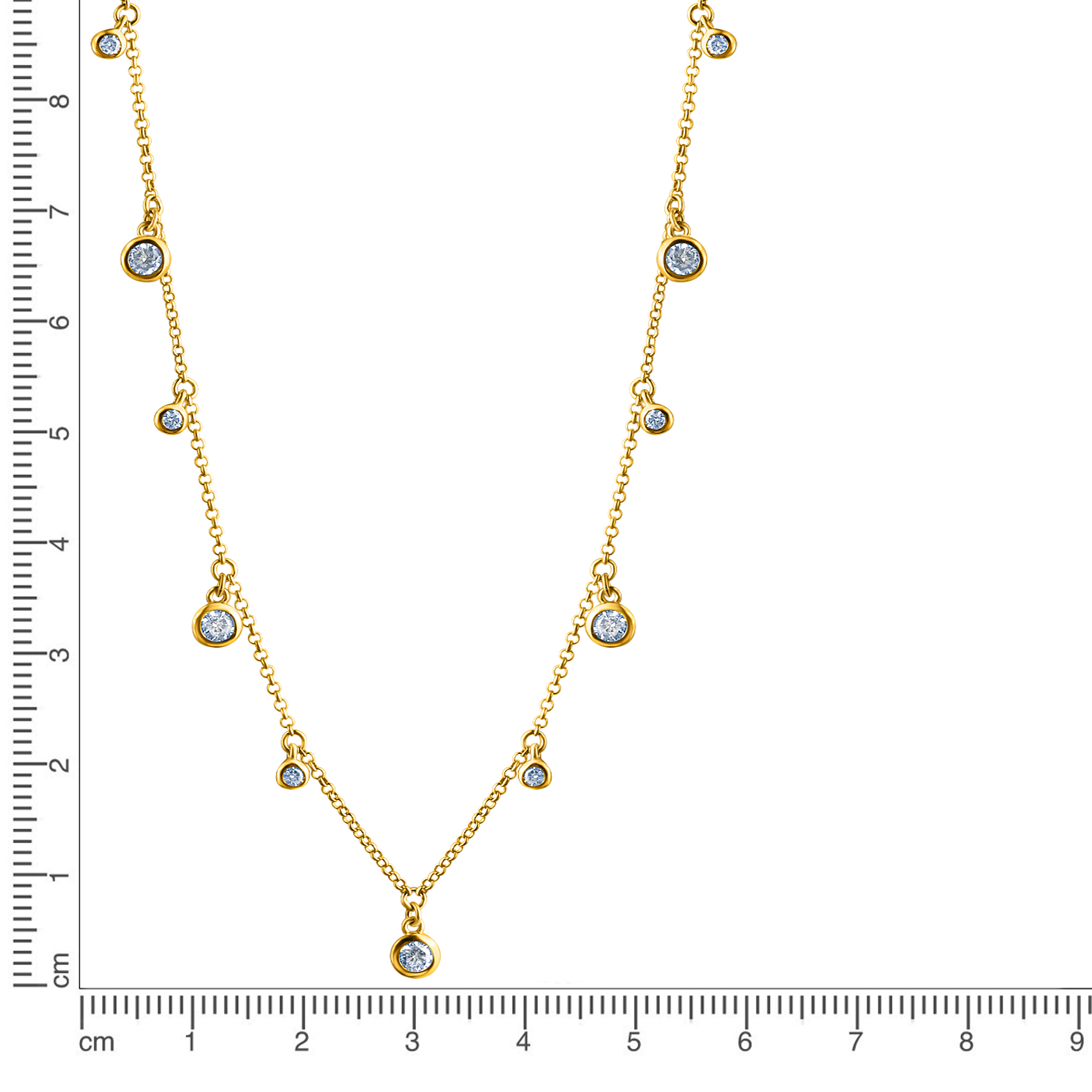 Das Highlight des Colliers sind die insgesamt 11 funkelnden Zirkonia Steine, die in einer Reihe angeordnet sind und dem Schmuckstück einen Hauch von Glamour verleihen. Die Steine sind sorgfältig gefasst und sorgen für ein strahlendes Funkeln bei jeder Bewegung. Das Collier Zirkonia hat eine Länge von 40cm und ist somit perfekt geeignet, um das Dekolleté zu betonen. Durch eine Verlängerung von 5cm kann die Länge individuell angepasst werden, um das Collier perfekt an den Hals anzupassen.
