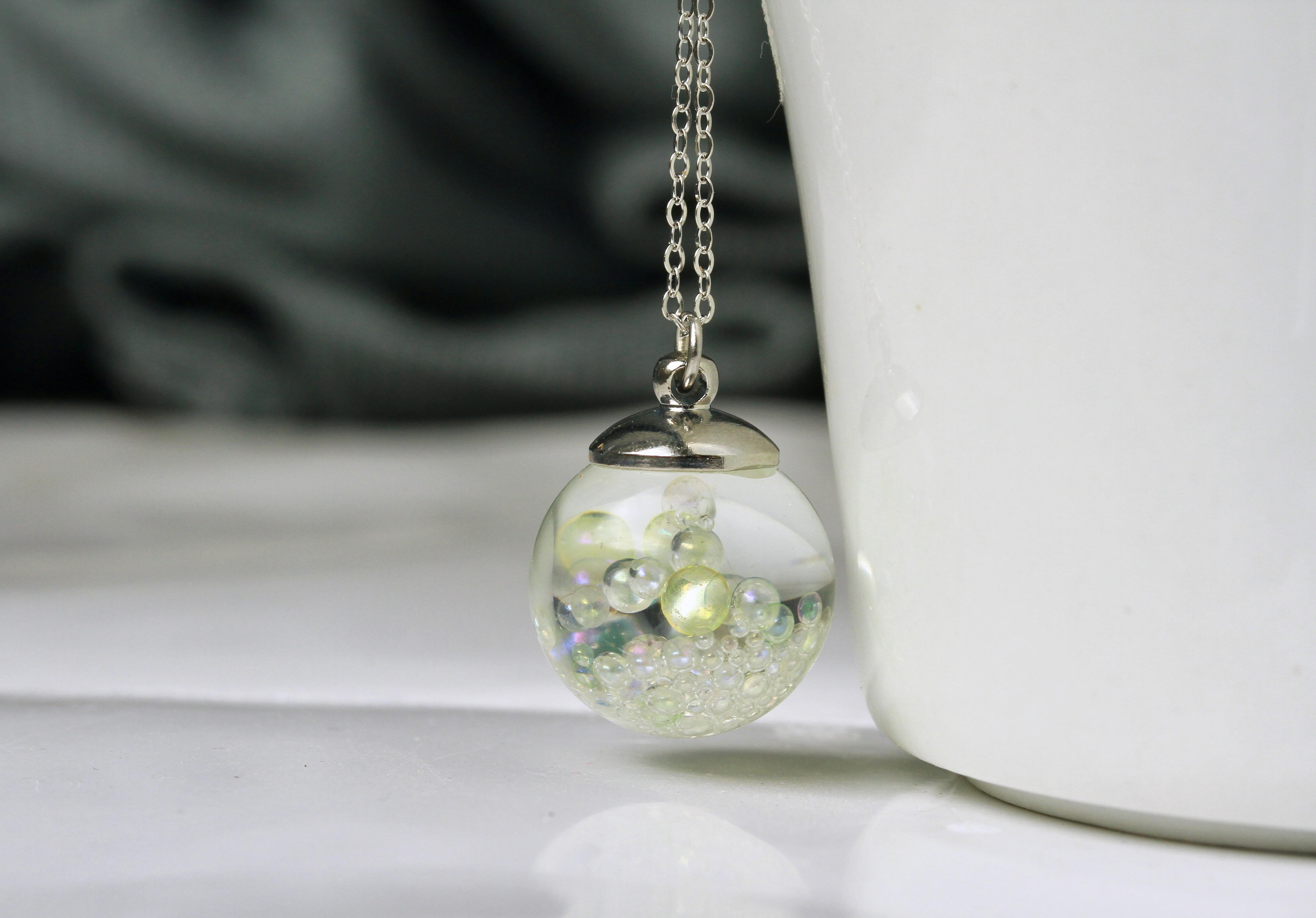 Diese wundervolle Kette besticht durch ihre einzigartige Glaskugel, in der viele unterschiedlich große, hohle Glasperlen eingefangen sind. Die Perlen erinnern an zarte Seifenblasen, die je nach Lichteinfall in verschiedenen Farben schimmern. Die Perlen sind in einer Glaskugel vereint und in Gießharz fixiert, wodurch ein zauberhaftes Gesamtkunstwerk entsteht.
