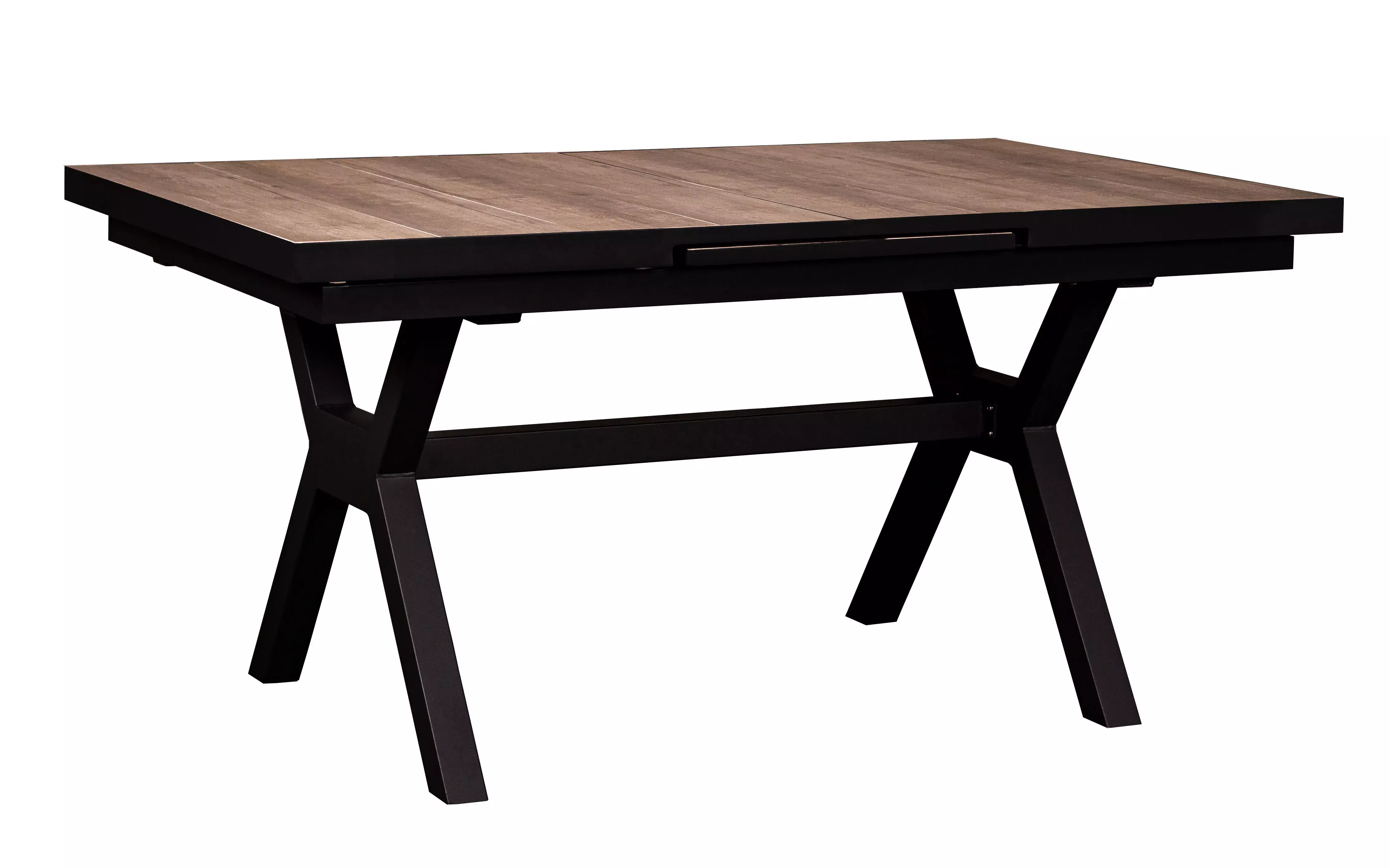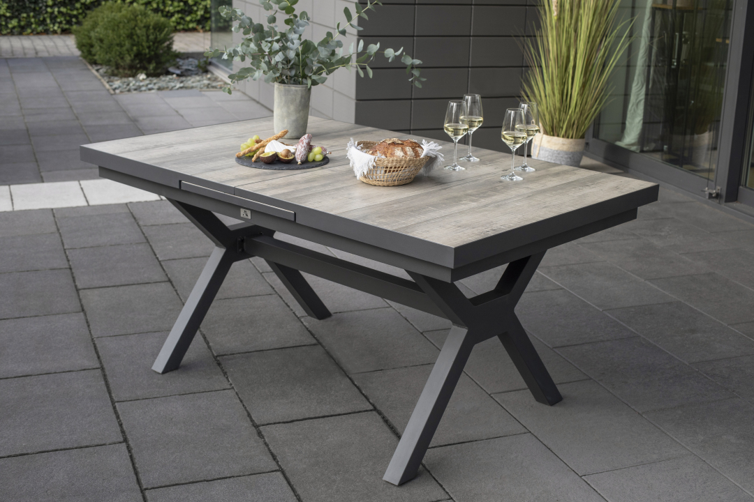 Die hochwertige Keramik-Tischplatte besticht durch ihre langlebige, pflegeleichte Oberfläche und elegante Eichenoptik, die jedem Raum ein modernes Flair verleiht. Das robuste X-Gestell aus pulverbeschichtetem Aluminium in Anthrazit sorgt für Stabilität und harmoniert perfekt mit der Keramikplatte, wodurch der Tisch zu einem echten Blickfang wird.