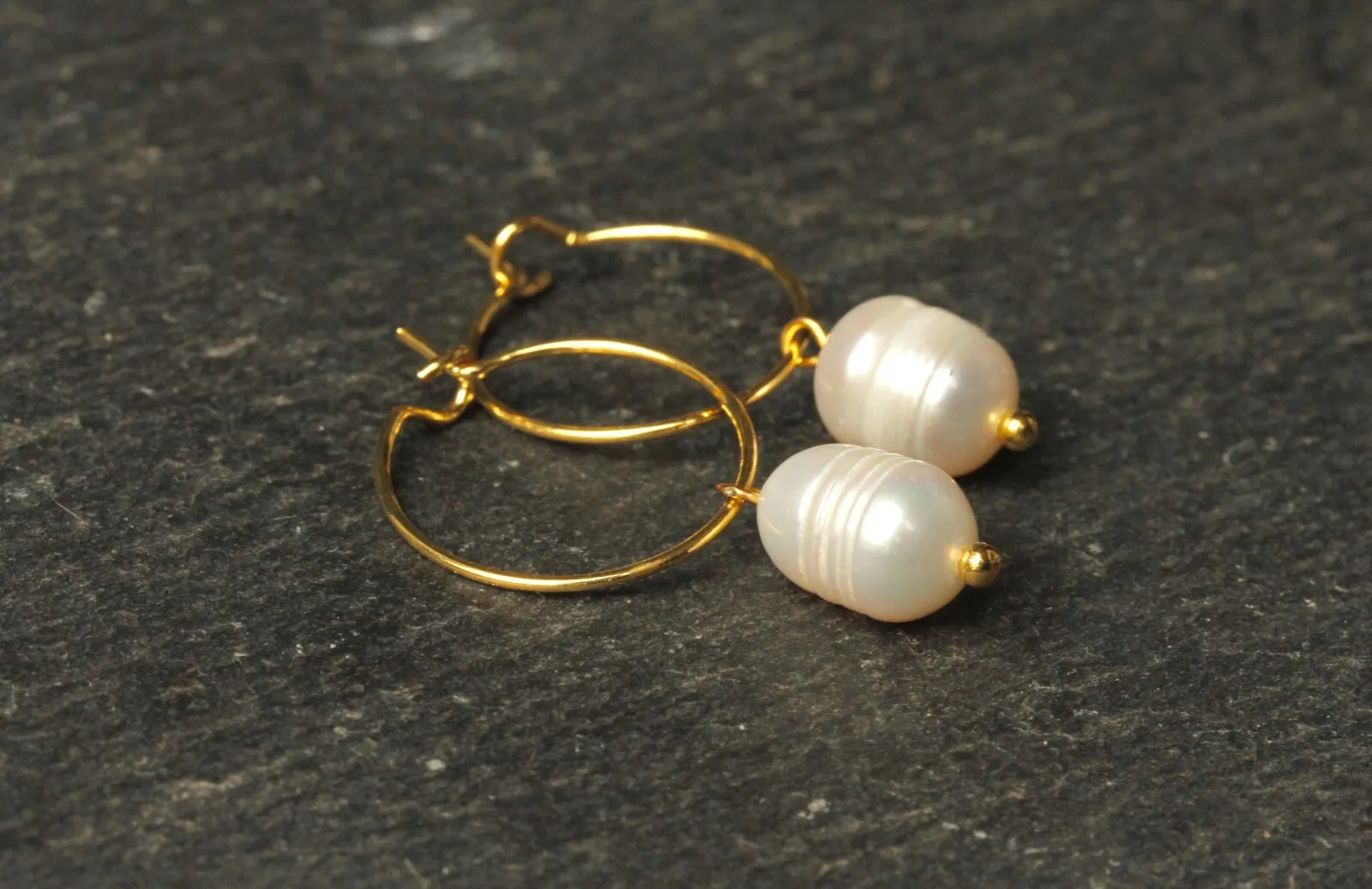 An kleinen Edelstahl-Creolen schwingen jeweils zarte, natürliche Süßwasserperlen.