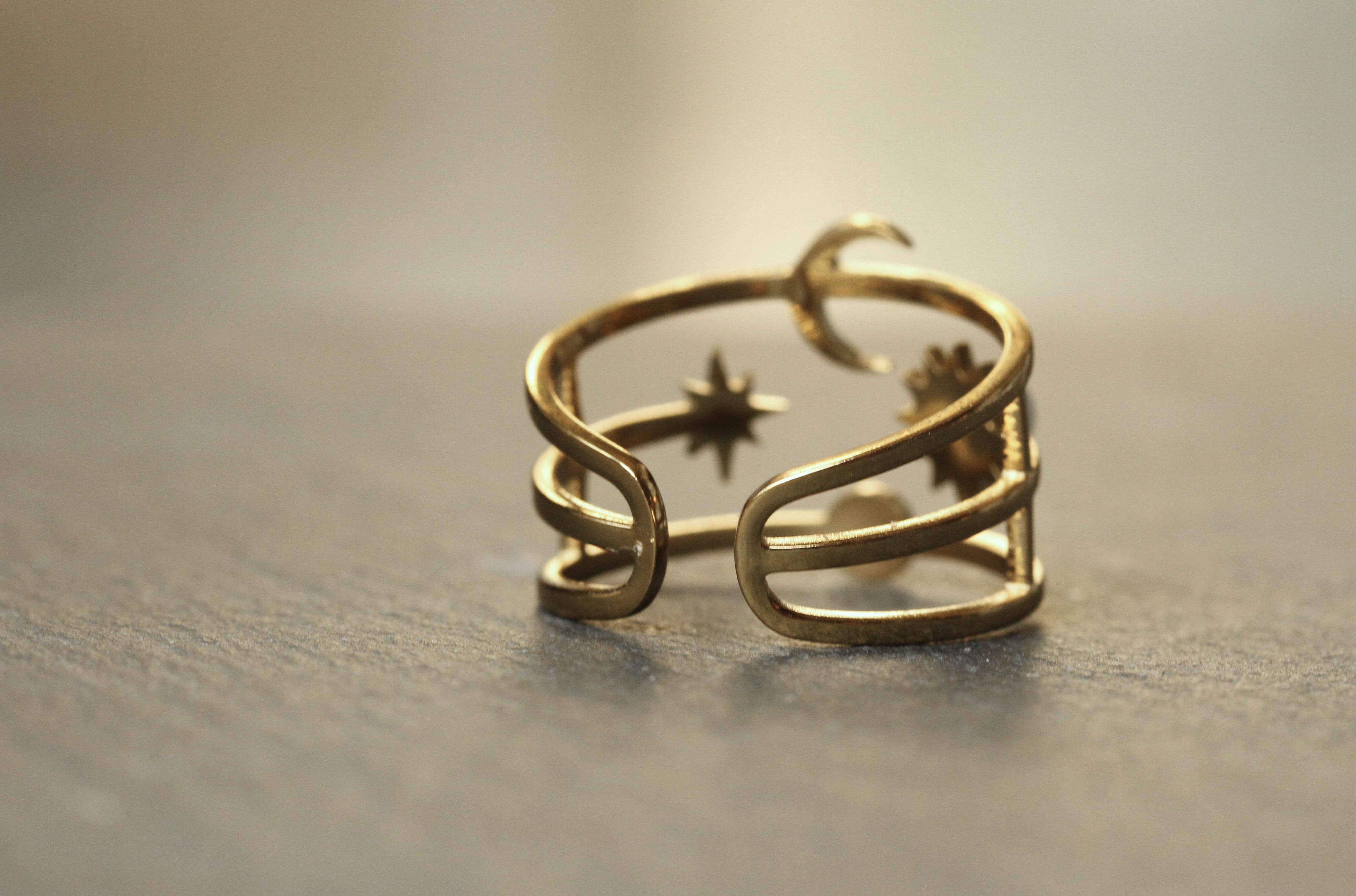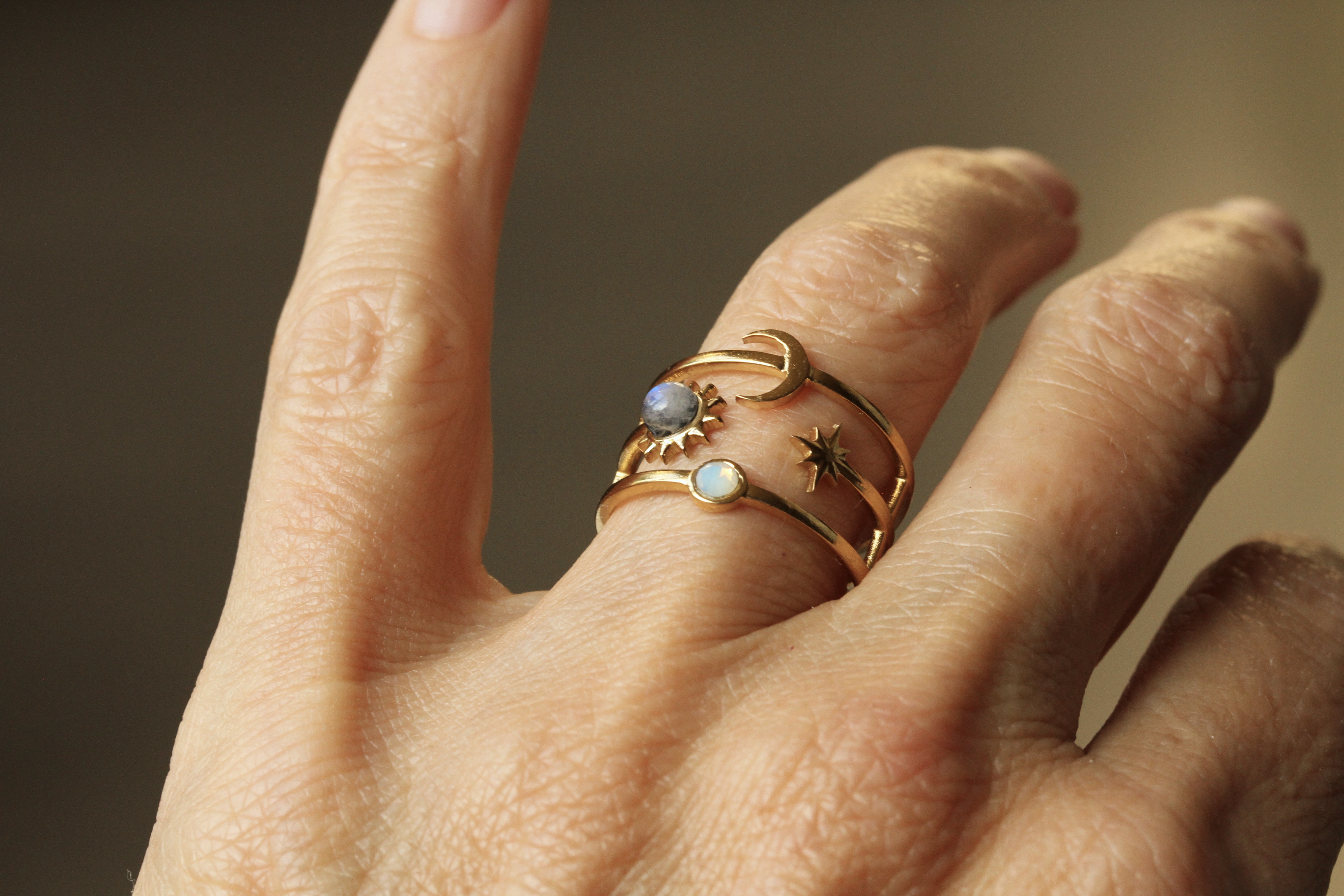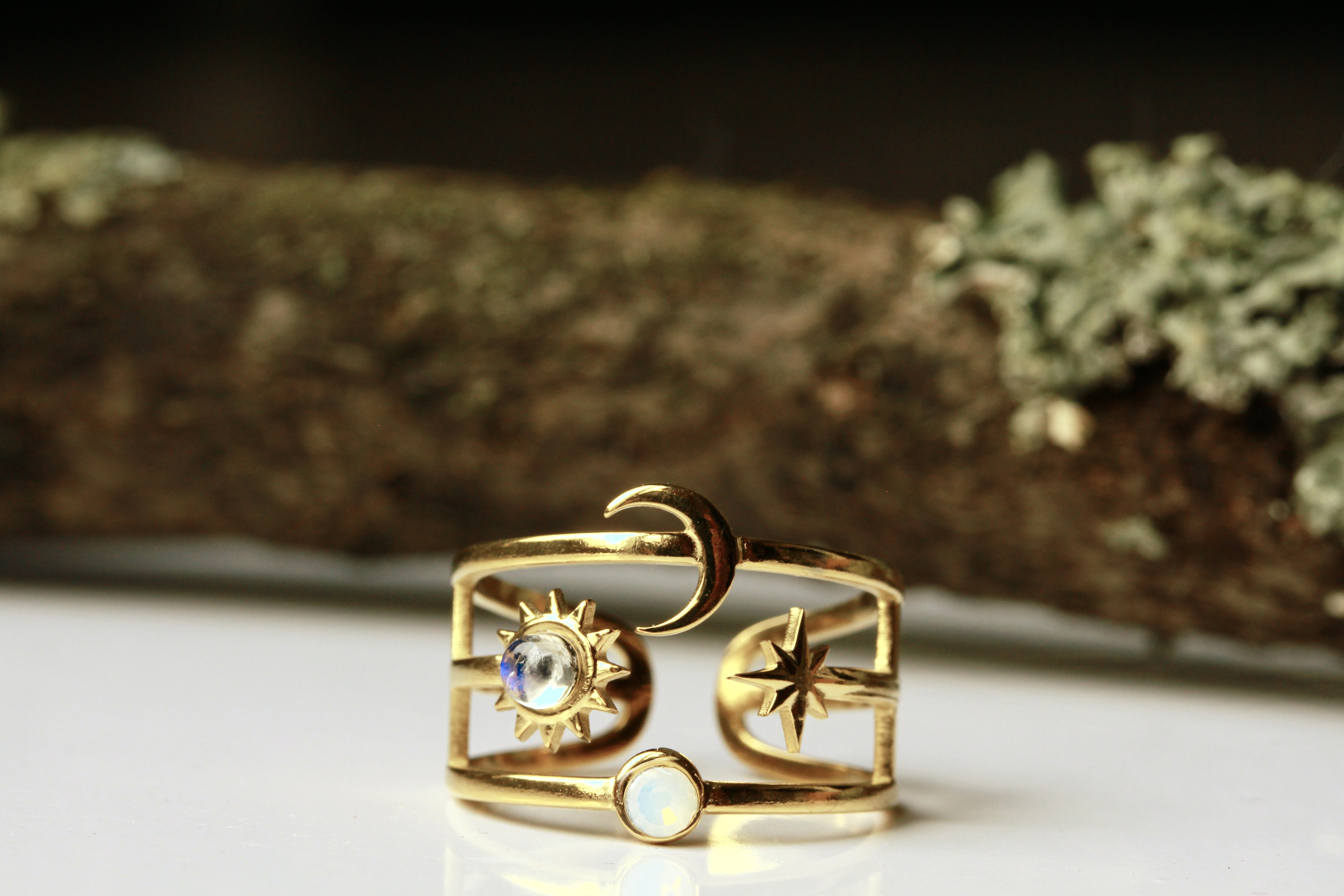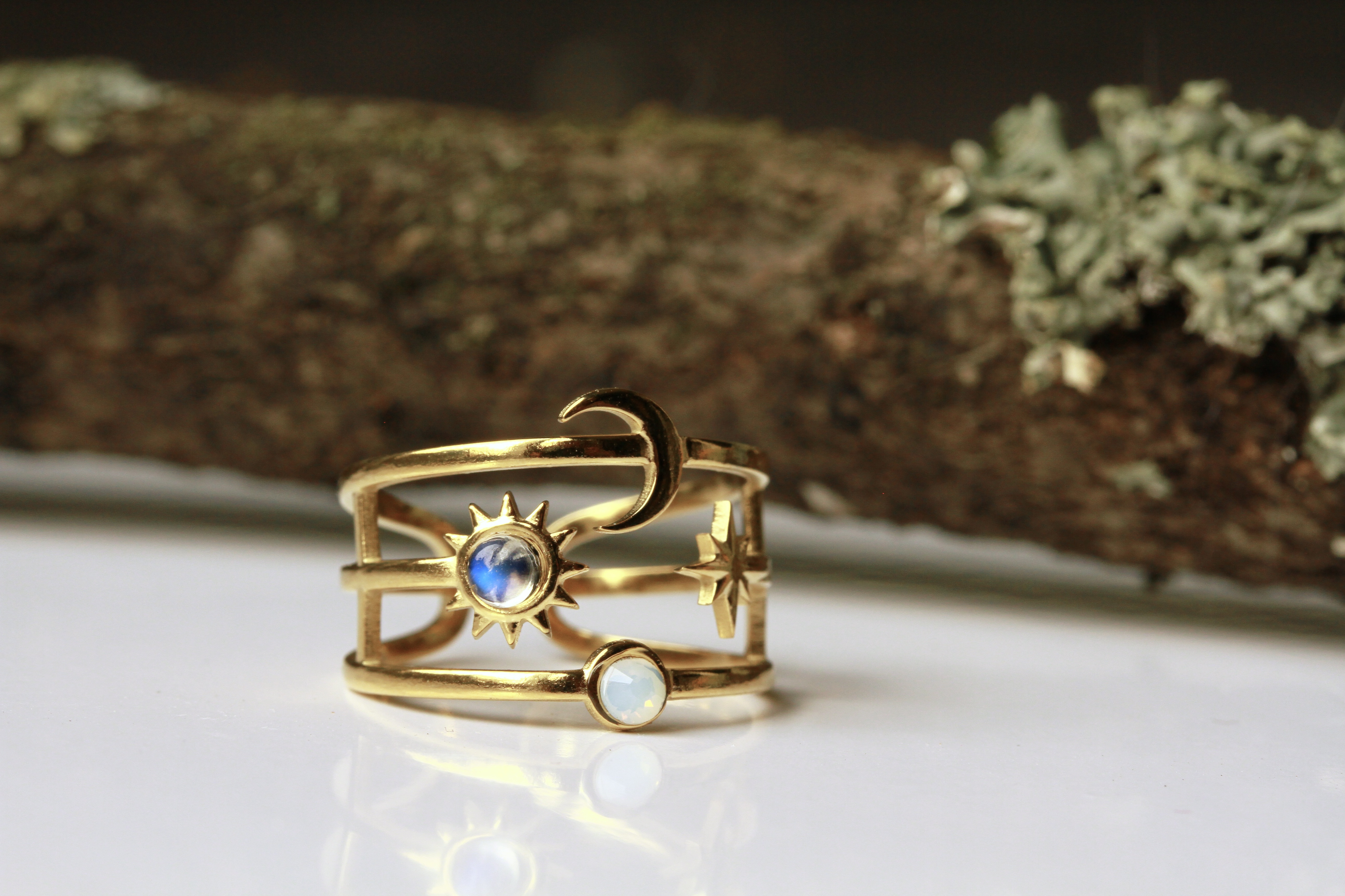 Moderner Ring aus echt vergoldeten Edelstahl mit einem himmlischen Halbmond, einem kleinen Stern, einer Sonne mit Mondstein besetzt und Vollmond mit kleinem Opalite.
