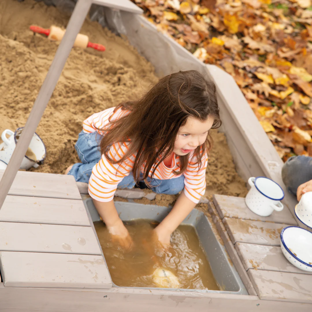Unter der praktischen Sitzbank befindet sich großzügiger Stauraum für Spielzeug, sodass alles ordentlich verstaut werden kann. Zudem ist eine hochwertige Kunststoffwanne integriert, die den Sand sicher hält und das Spielen noch angenehmer macht. Das Sonnendach schützt vor direkter Sonneneinstrahlung und ermöglicht unbeschwertes Spielen an warmen Tagen.