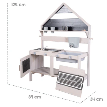Die robuste Kunststoffwanne eignet sich ideal für kreative Matsch- und Wasserspiele und sorgt für zusätzlichen Spaß im Freien. Die Küche wird durch praktisches Küchenzubehör wie Töpfe, Deckel und einen Schöpflöffel aus kindersicherem Material ergänzt. Einhängbare Wasserbehälter und ein Wasserhahn machen das Spielerlebnis noch realistischer.