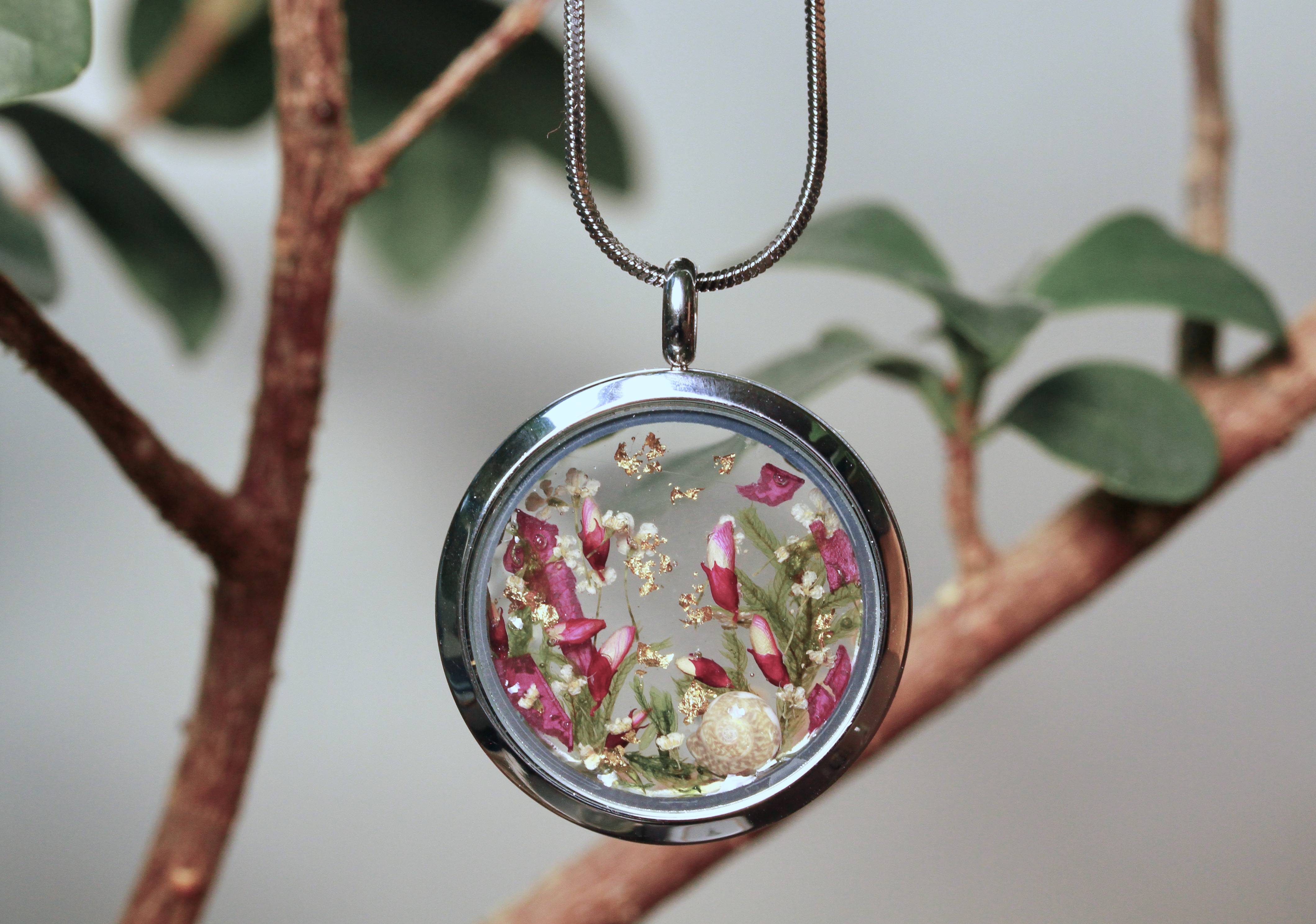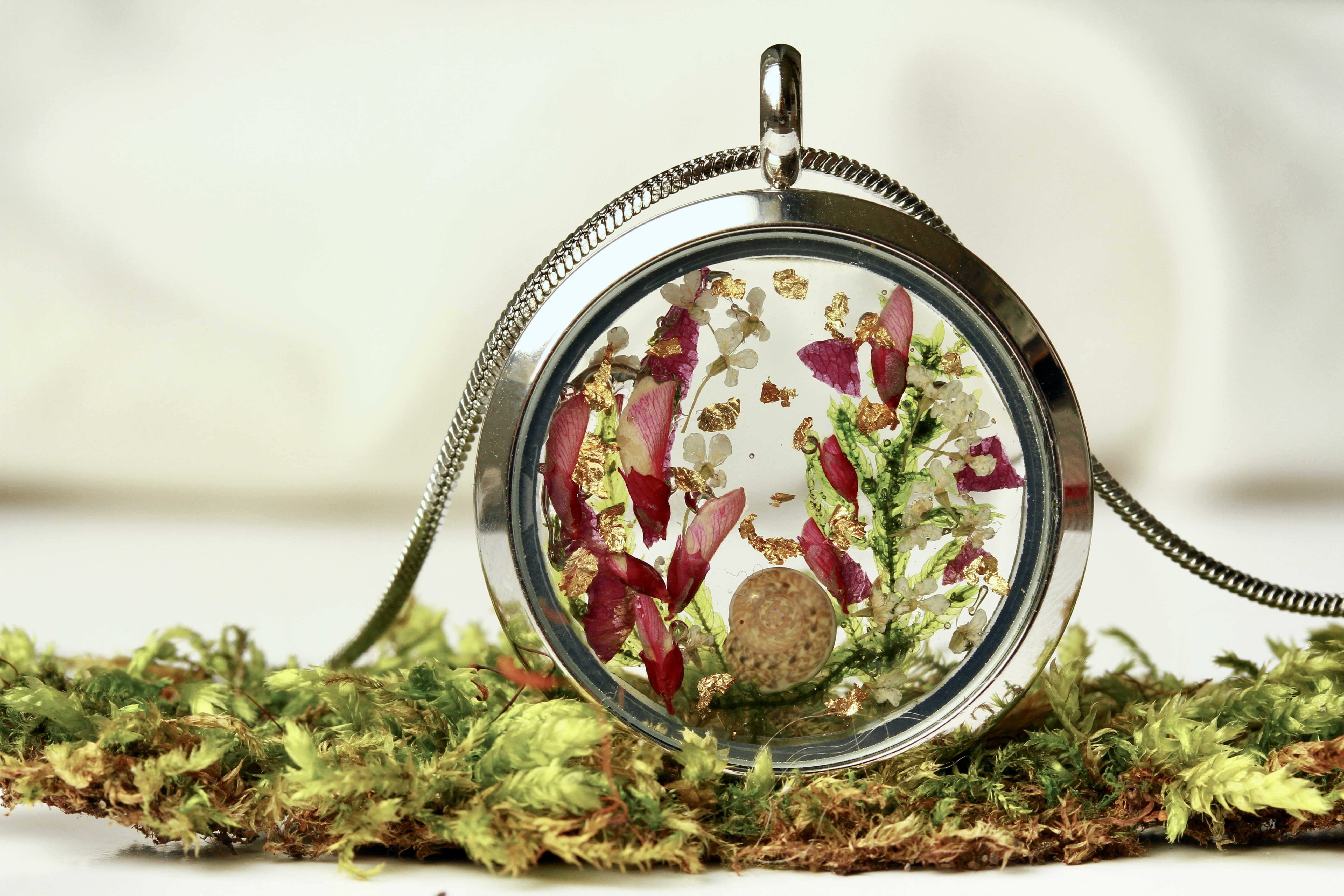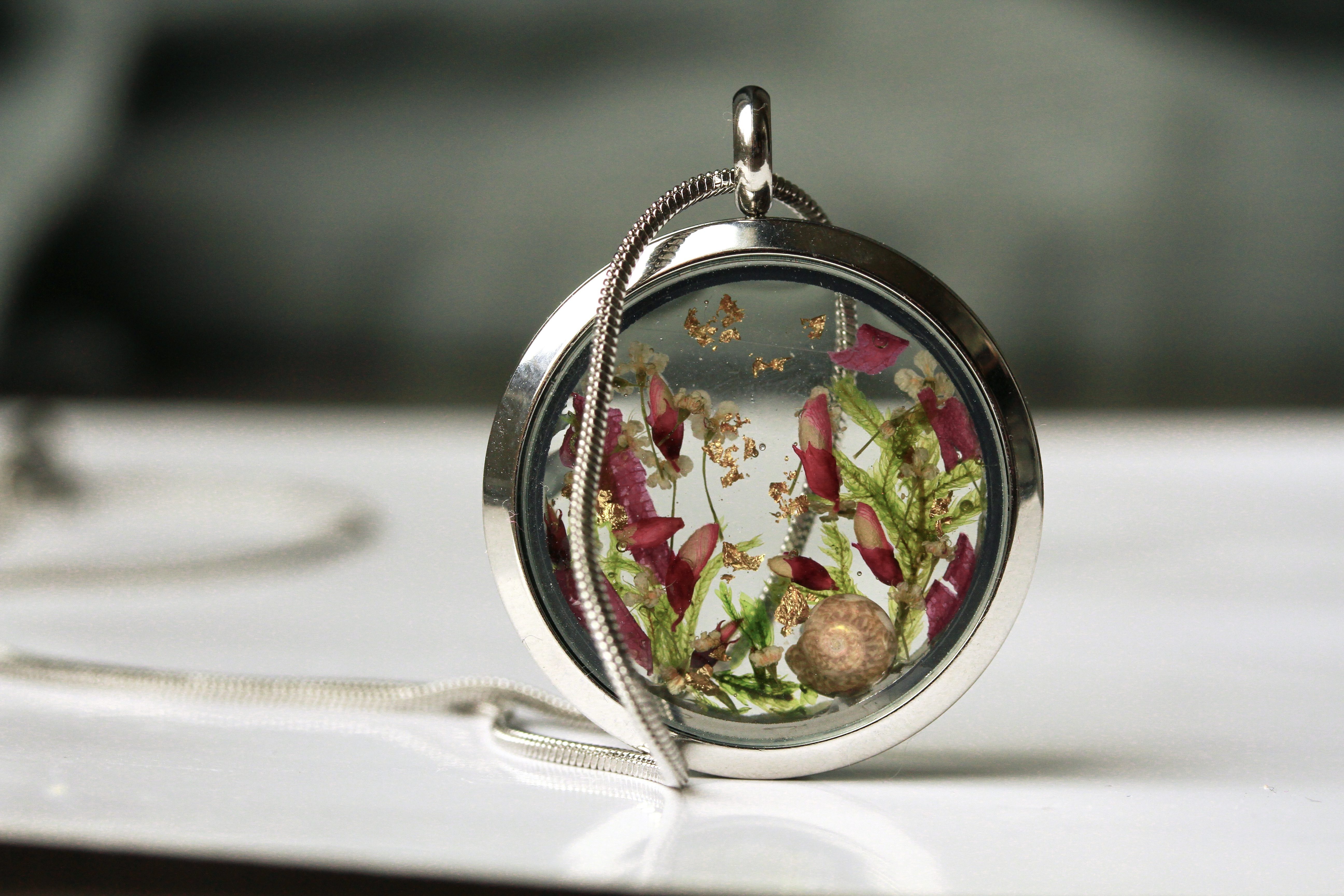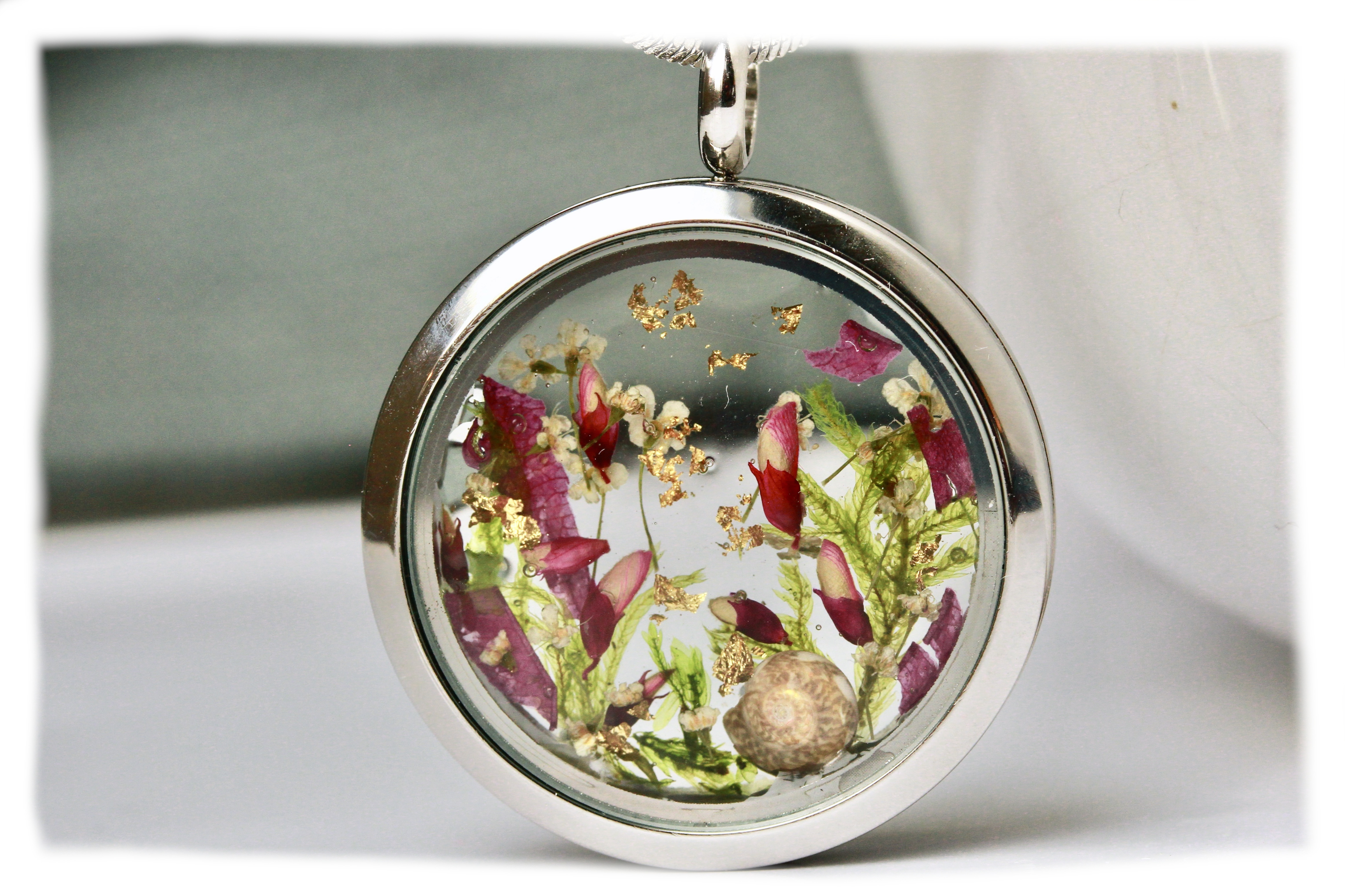 Eine kleine Miniatur Landschaft aus völlig naturbelassenen Blüten, Blätter, Moos, Gräsern, Blattgold und einer kleinen Muschel, verewigt und fixiert hinter Gießharz in einem Medaillon aus robusten Edelstahl mit Glasfenster.