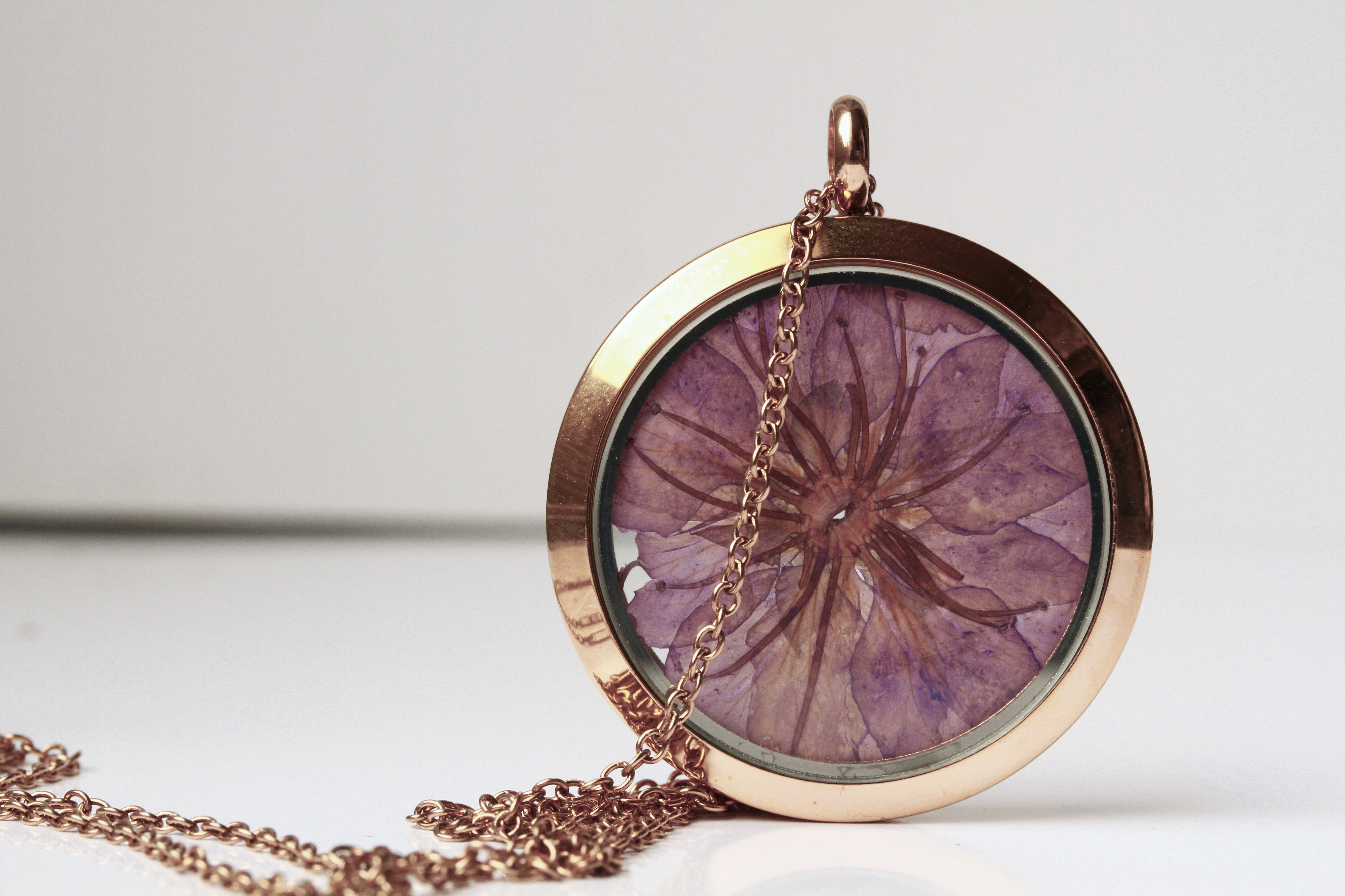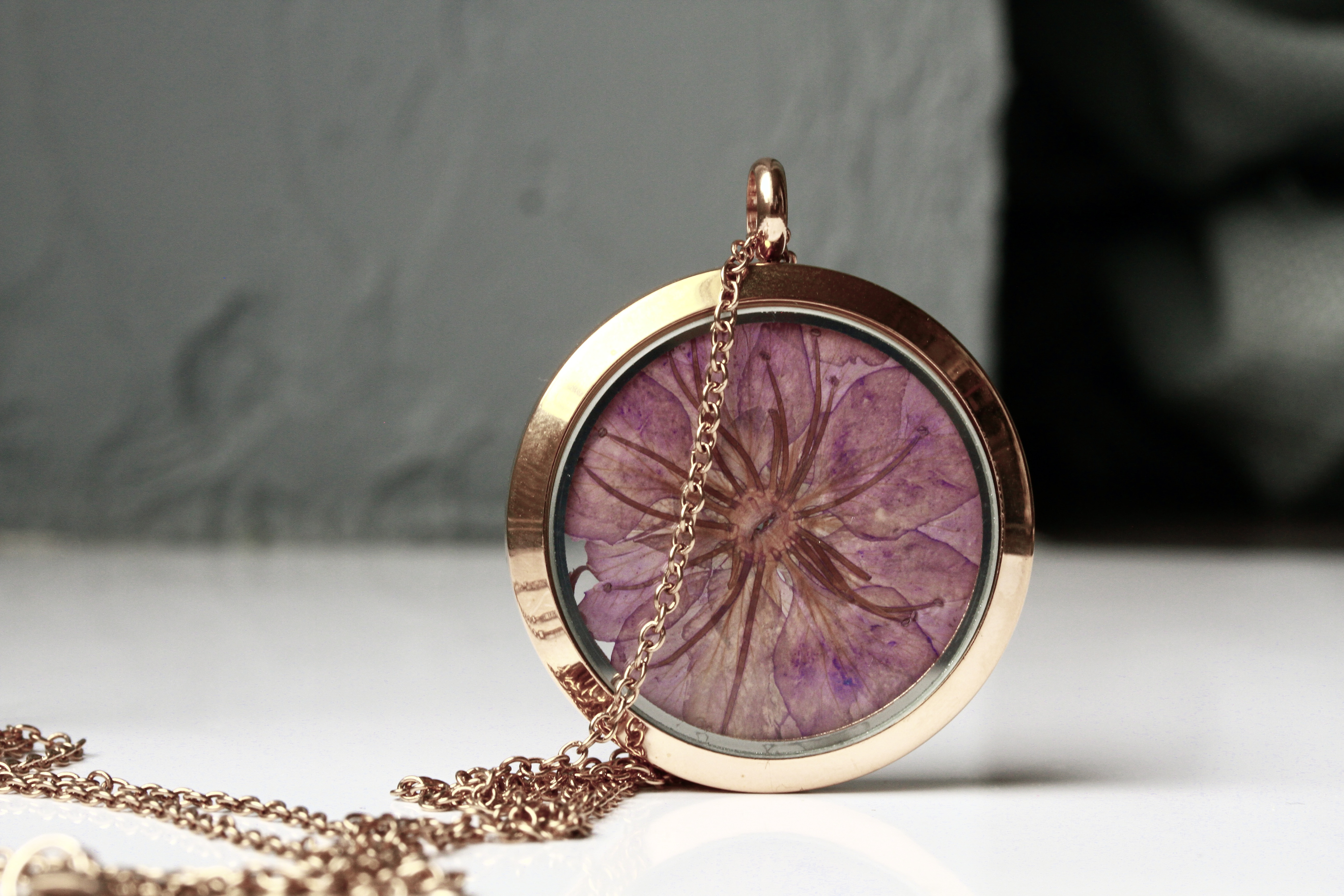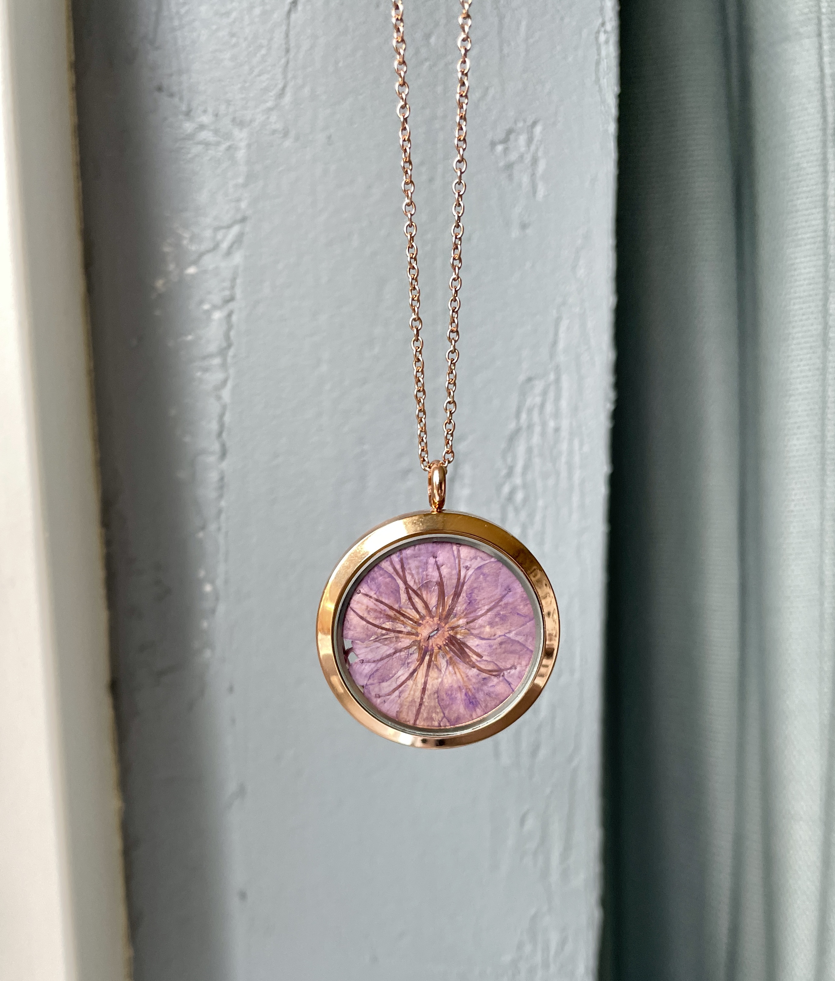 Ein kleines Stück Natur in Form einer gepressten lila Blüte, liebevoll geschützt in einem wunderschönen Medaillon aus roségoldfarbenem Edelstahl mit einem Glasfenster an einer langen Kette.