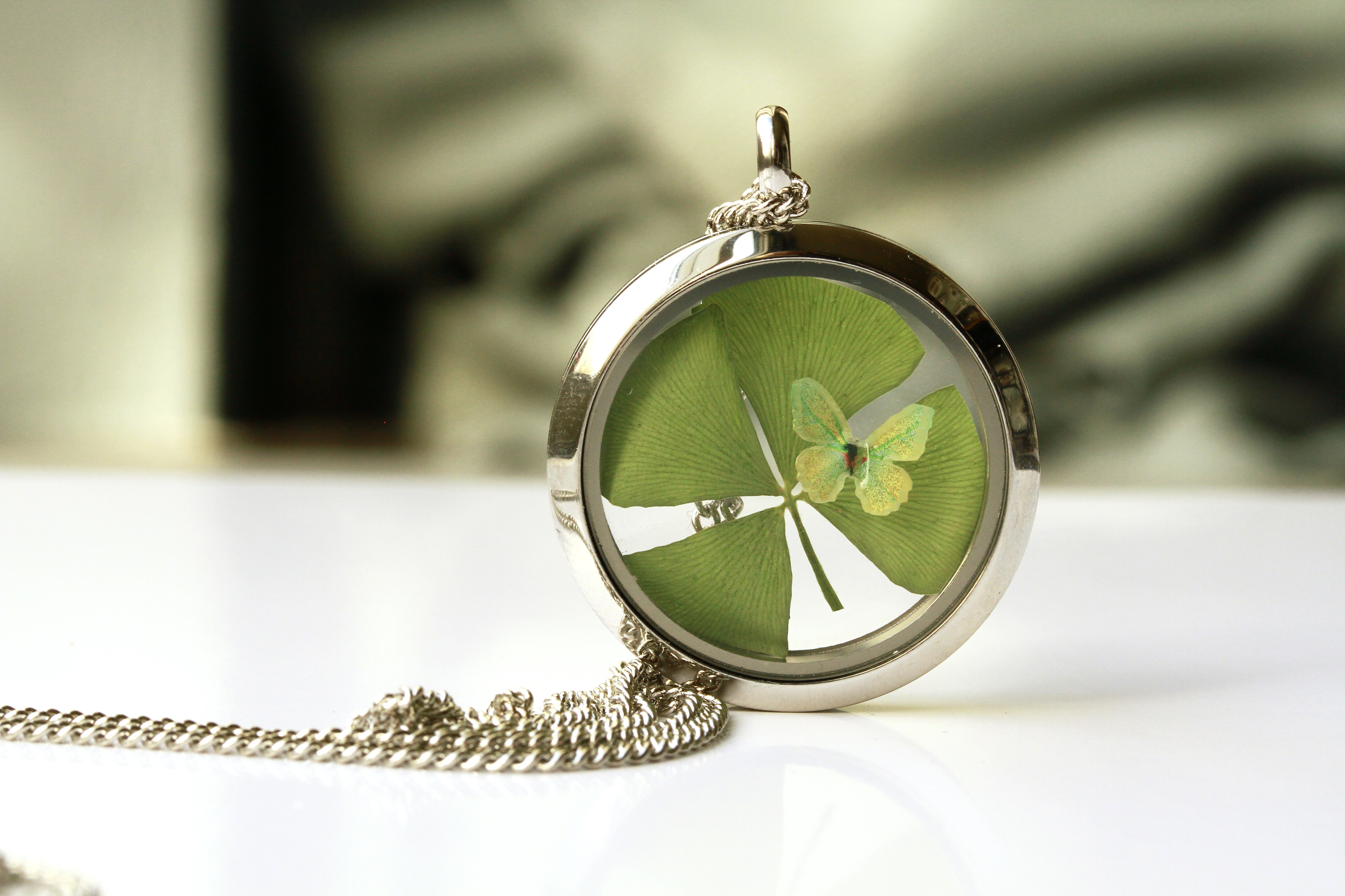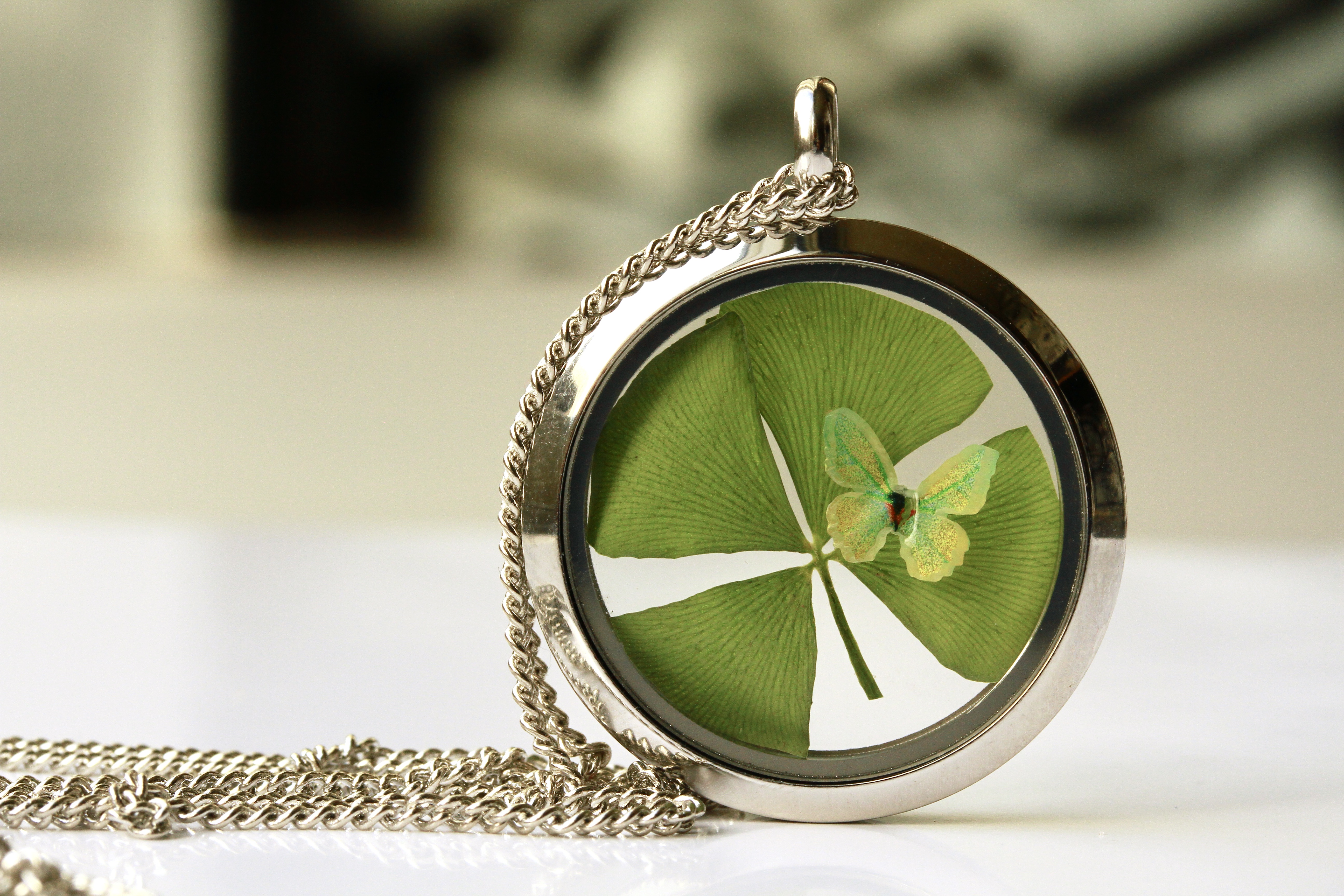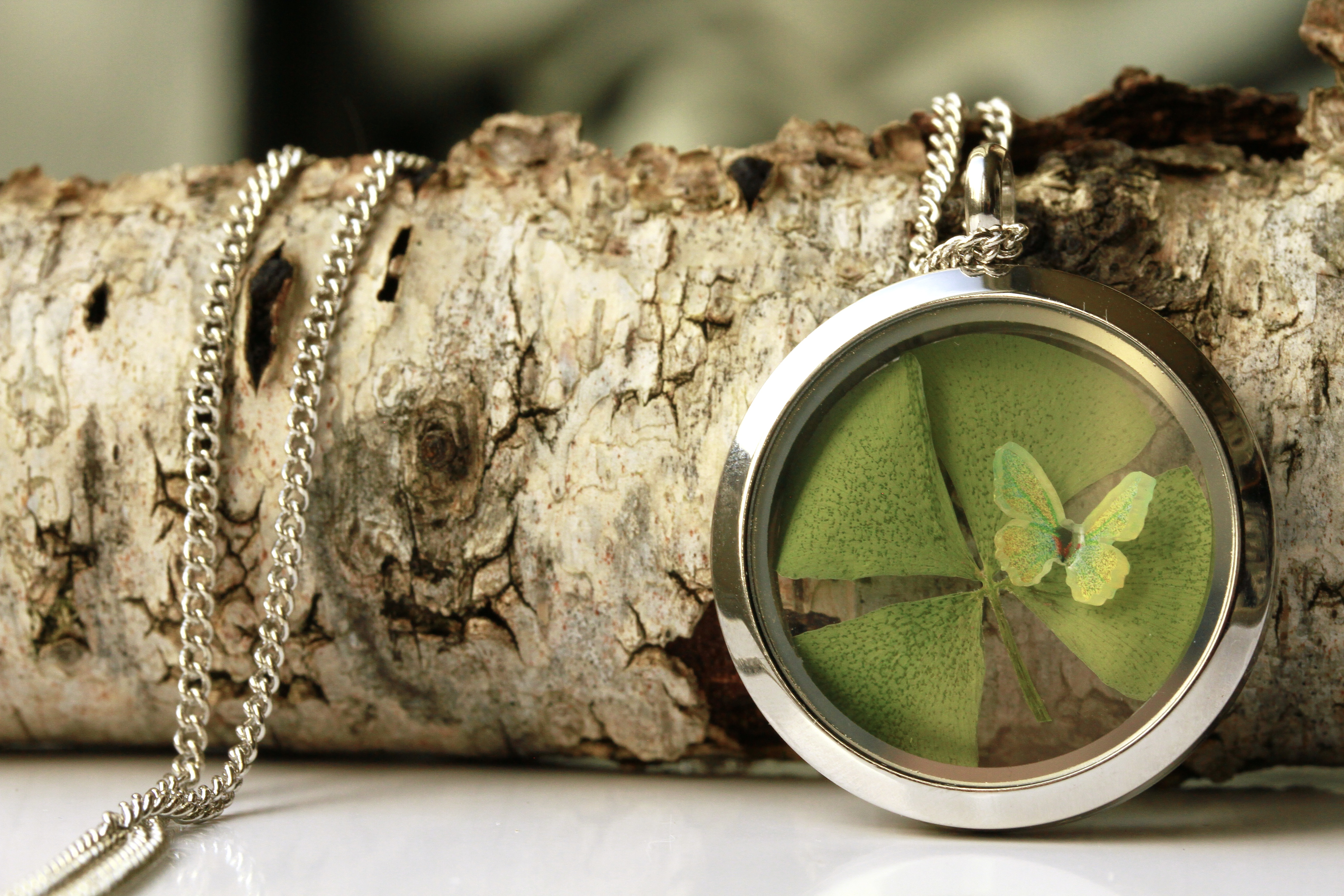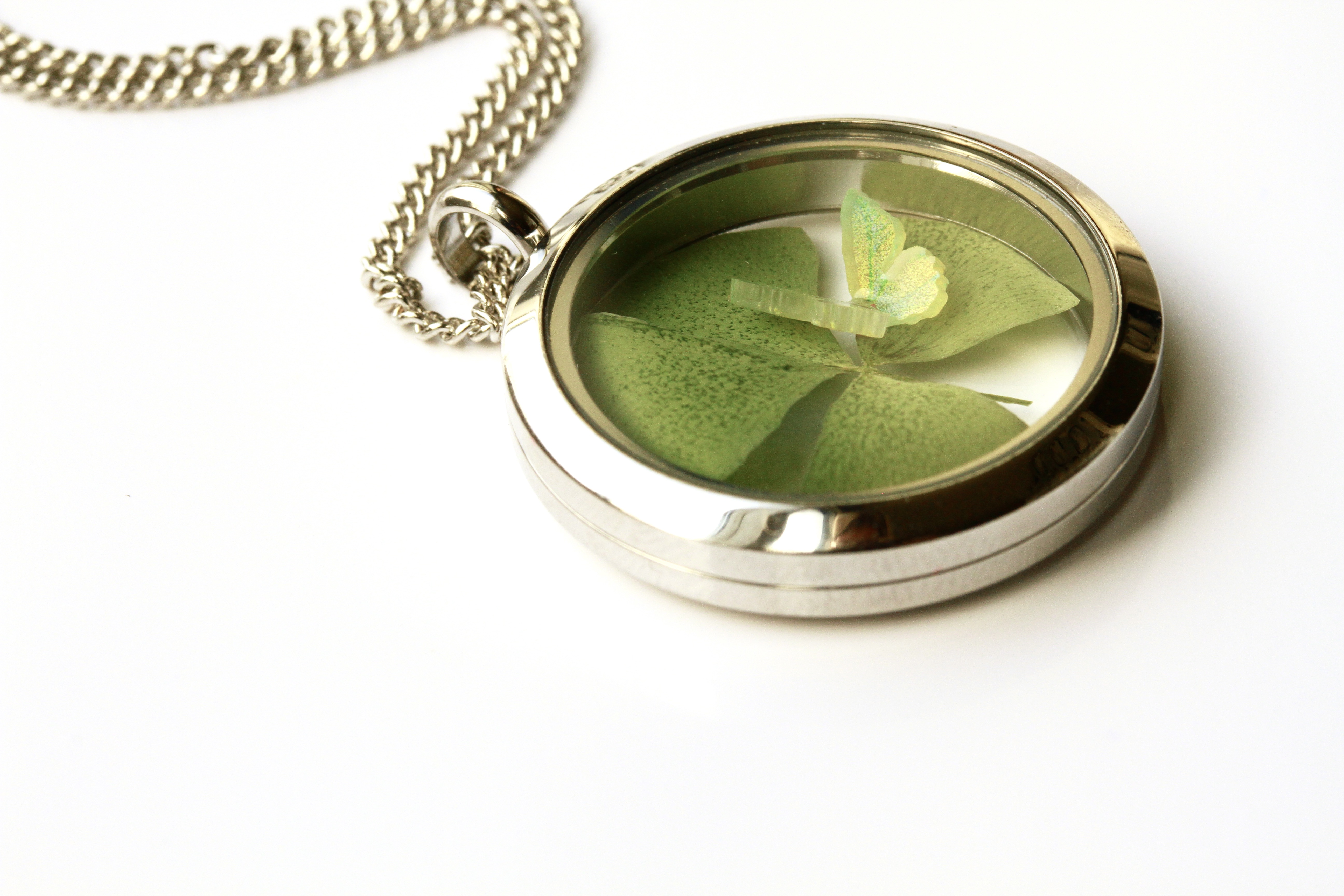 Hier wurde ein vierblättriges Kleeblatt mit einem kleinen Schmetterling aus Resin in einem Medaillon aus robusten Edelstahl mit Glas-fenster platziert.