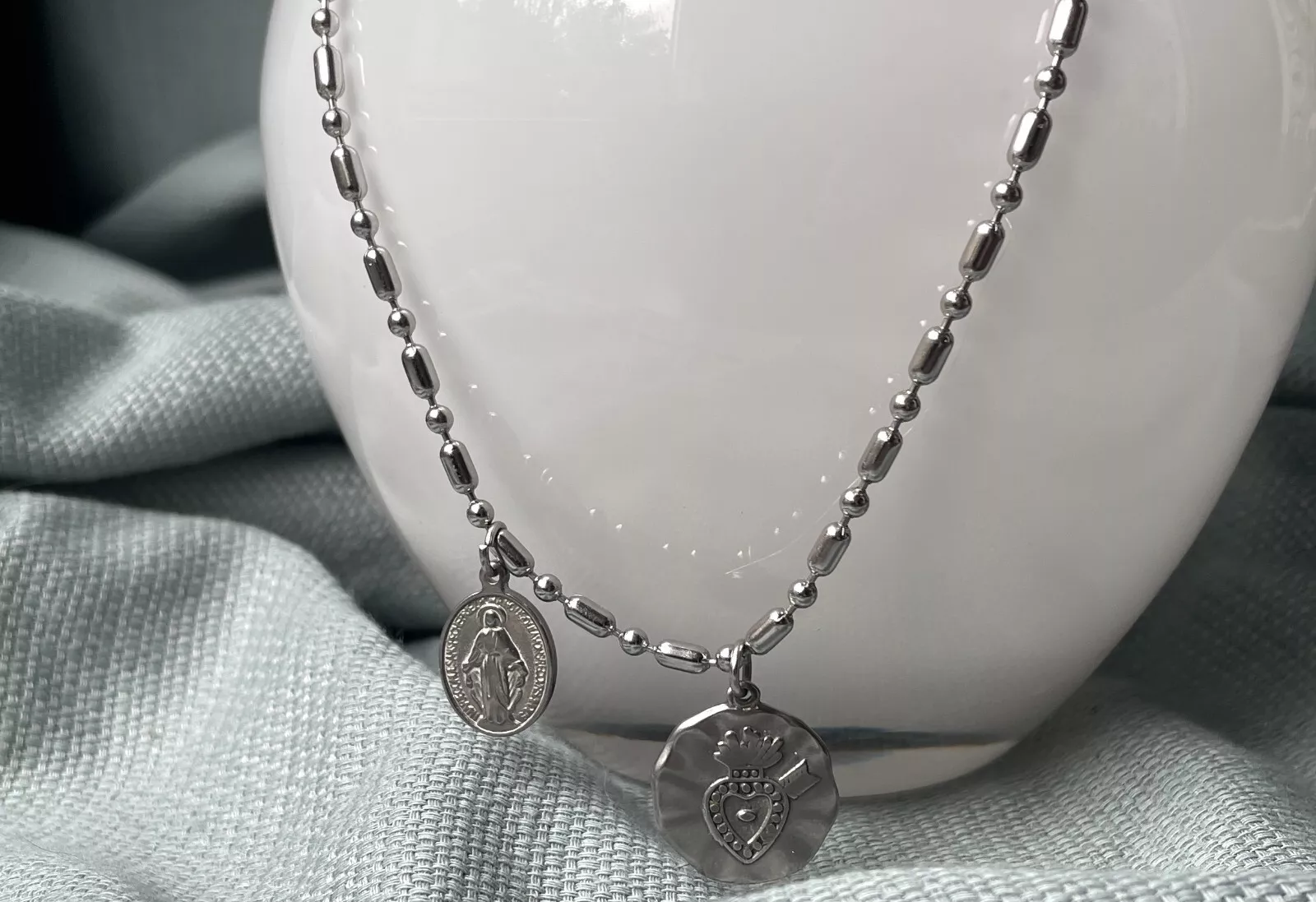 Diese Kette ist das ideale Accessoire für besondere Anlässe oder um deinem Alltagsoutfit einen Hauch von Raffinesse zu verleihen. Sie eignet sich auch hervorragend als einzigartiges Geschenk für die Liebsten. Die beiden Anhänger – ein Herz und die Mutter Maria – harmonieren perfekt miteinander und machen die Kette zu einem wunderschönen Schmuckstück, das sowohl eine tiefere Bedeutung tragen kann, aber nicht muss. Edelstahl ist formstabil und wasserfest, wodurch es sich ideal für den täglichen Gebrauch eignet.