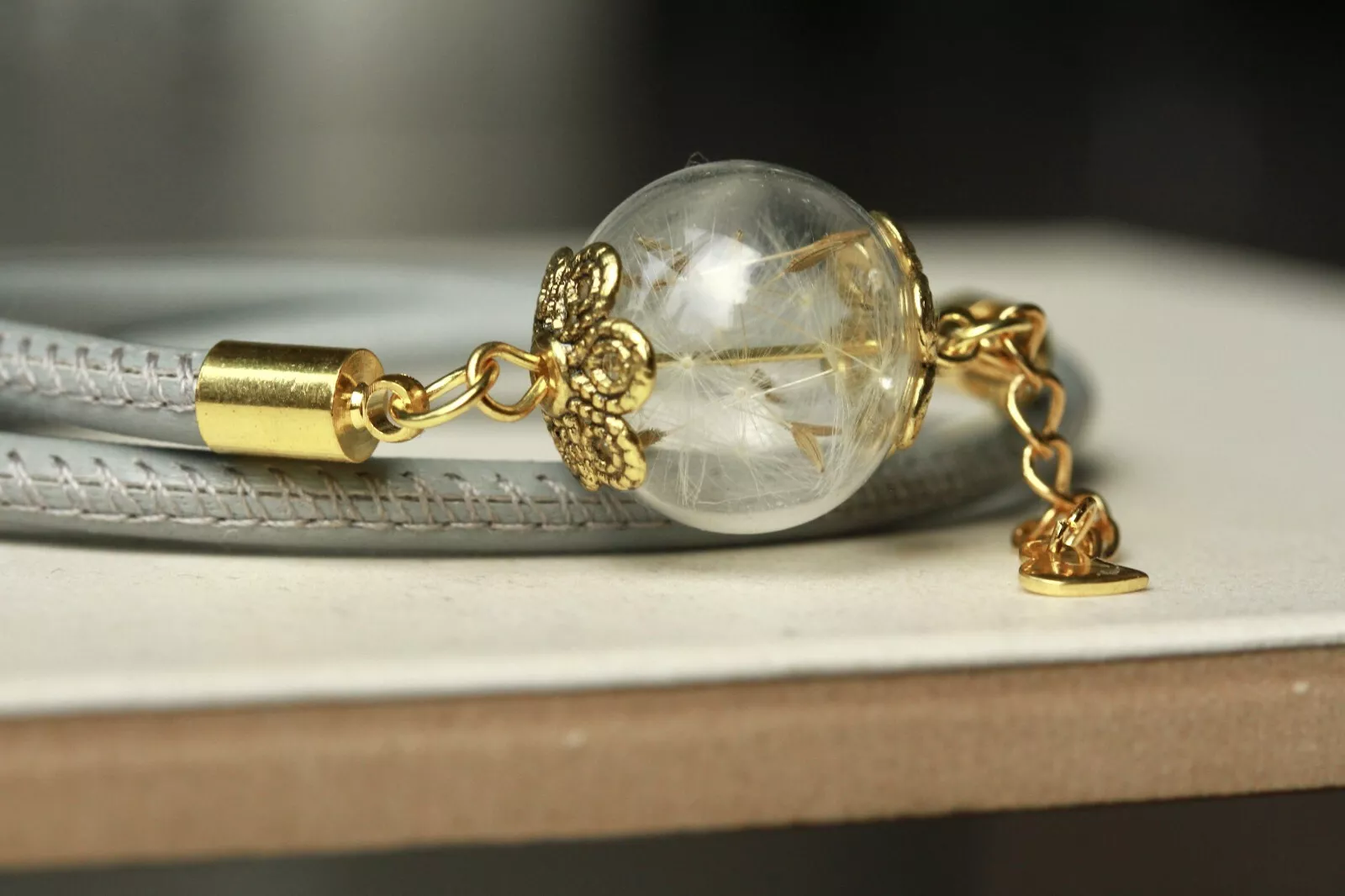 Das Armband schließt mit einem kleinen Karabiner und vereint auf stilvolle Weise die natürliche Schönheit der Pusteblumen mit dem luxuriösen Tragekomfort von Nappaleder. Ein zartes und doch ausdrucksstarkes Accessoire für jeden Tag.