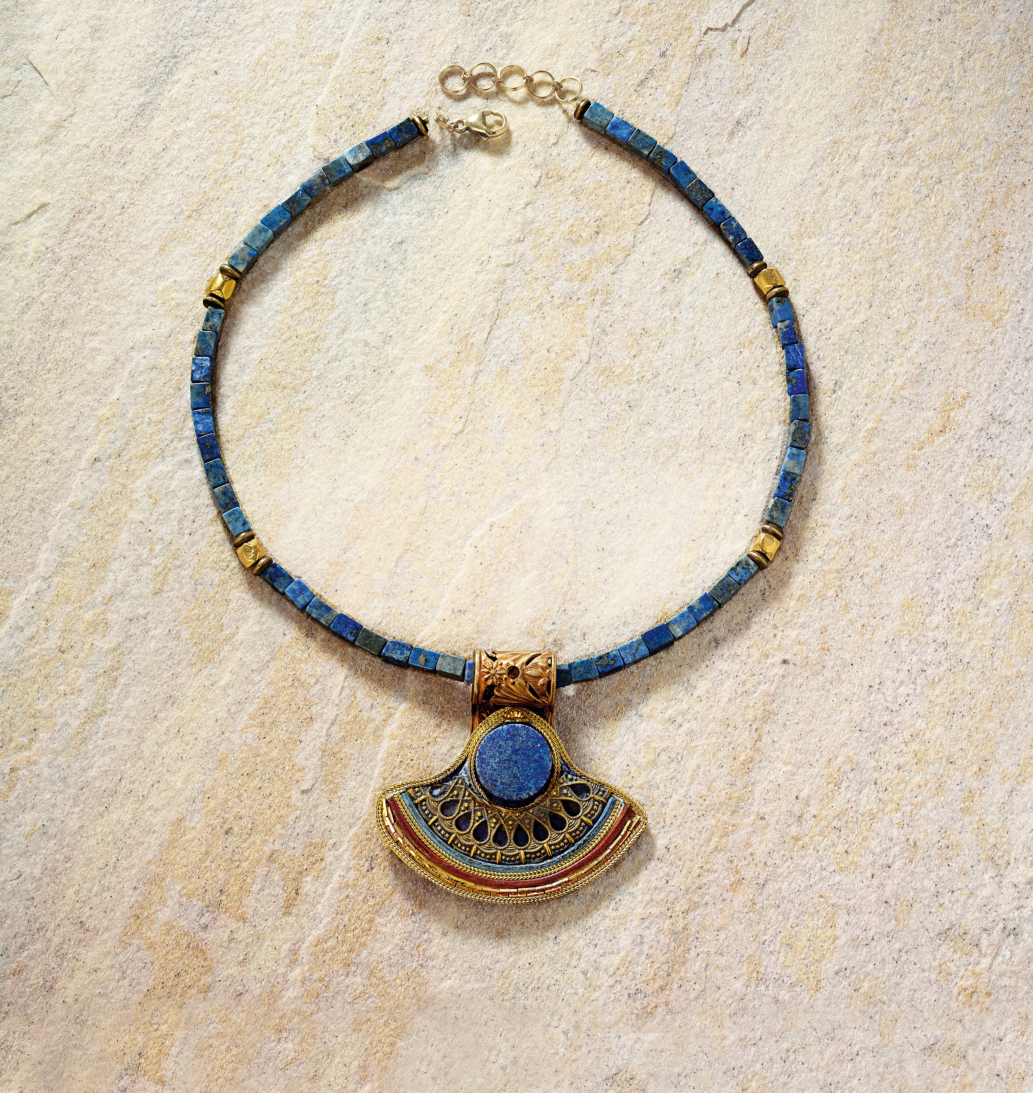 Dieses elegante Collier mit Anhänger besteht aus echtem Lapislazuli und mit 24 Karat vergoldetem Messing, z.T. handkoloriert.