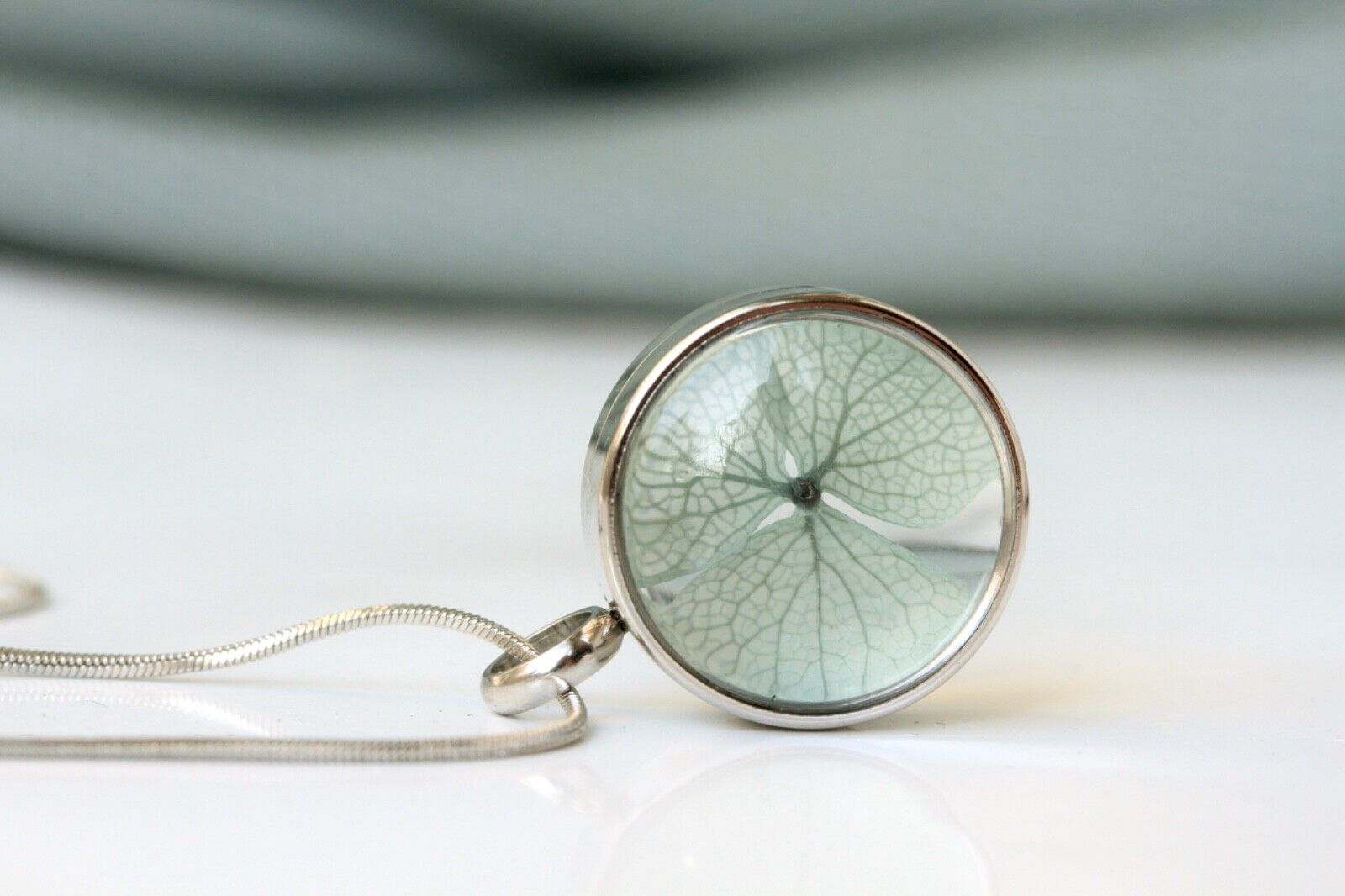 Ein kleines Stück Natur, eingefangen in einem zarten Medaillon: Eine gepresste blaue Hortensienblüte liegt sicher geschützt hinter einem gewölbten Glasfenster, eingefasst in Edelstahl und kombiniert mit einer eleganten Schlangenkette. Die gewölbte Glasform erzeugt einen sanften Vergrößerungseffekt, der die zarte Blüte besonders hervorhebt.
