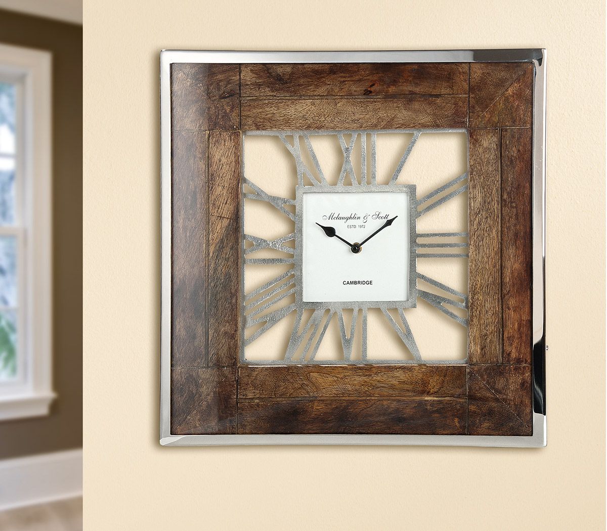 Die quadratische Wanduhr London kombiniert rustikalen Charme mit modernem Design. Gefertigt aus braunem Mangoholz, setzt sie mit silberfarbenen Details stilvolle Akzente. Die schwarzen Zeiger heben sich kontrastreich ab und sorgen für eine klare Ablesbarkeit.