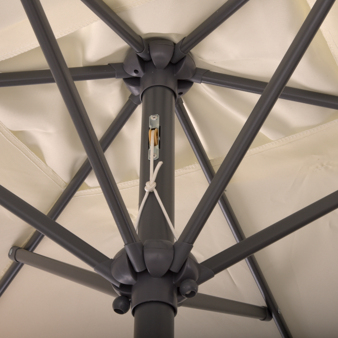 Das stabile Stahlgestell ist pulverbeschichtet und sorgt für zuverlässige Standfestigkeit, selbst bei leichtem Wind. Der integrierte Kurbelmechanismus ermöglicht ein einfaches Öffnen und Schließen des Schirms, während die bequeme Höhenverstellung eine individuelle Anpassung an alle Bedürfnisse erlaubt.