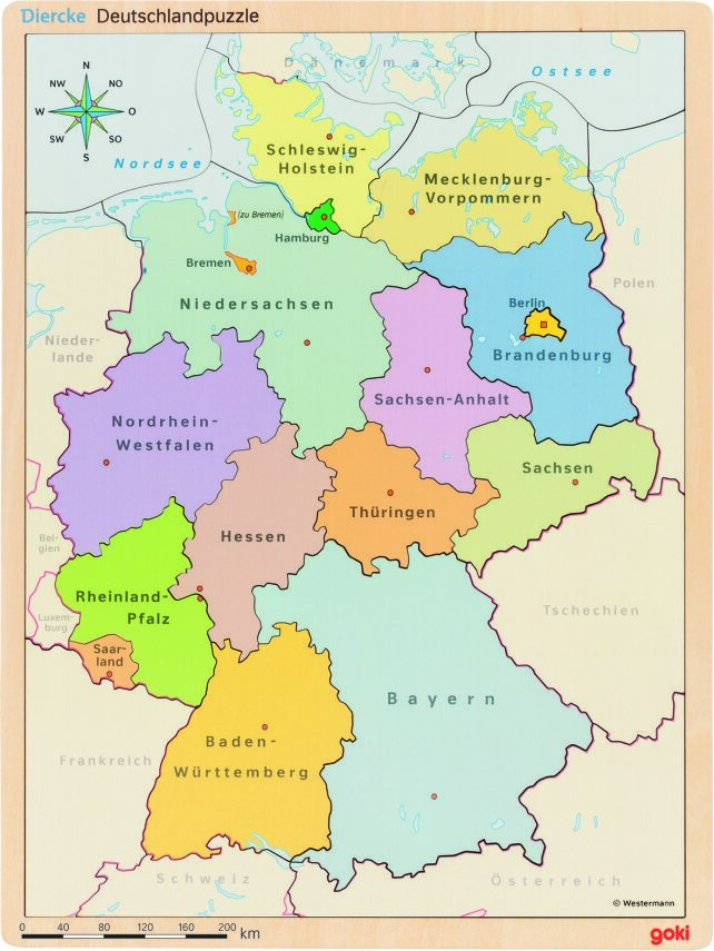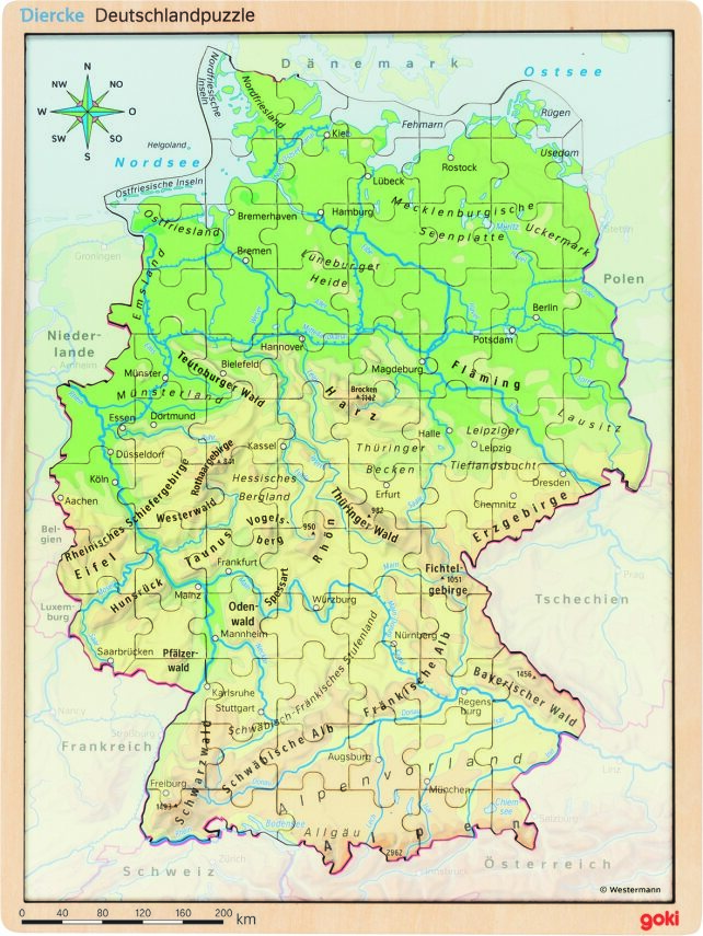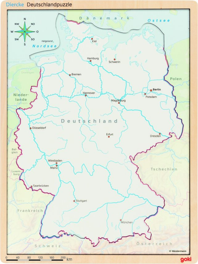 Das große Deutschlandlernpuzzle: In Zusammenarbeit mit dem Diercke Verlag und goki entstand dieses einzigartige, dreischichtige Lernpuzzle. Die hochwertigen Holzteile der Puzzleebenen sind austauschbar, sodass Gebirge, Flüsse, Bundesländer und Landeshauptstädte aus verschiedenen Perspektiven zugeordnet werden können. So entsteht ein vertiefender Lerneffekt fast von selbst. Mit dem fundierten Wissen von Diercke und der spielerischen Umsetzung von goki wird Lernen zum Vergnügen. Viel Freude beim "Lernspielen"!
