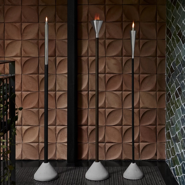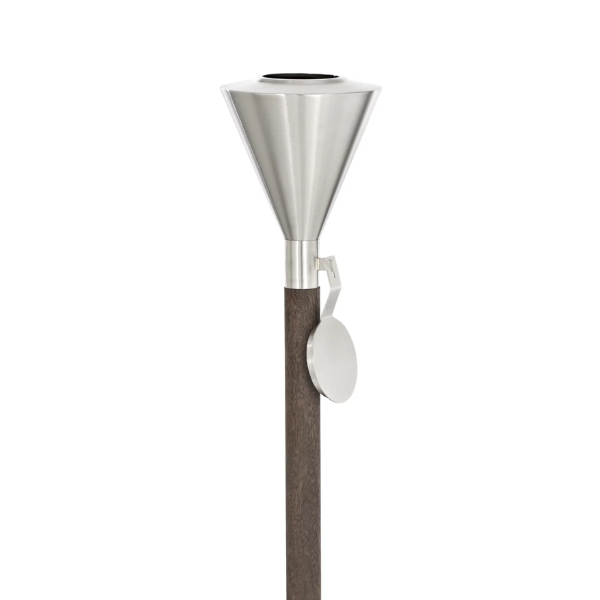 Die Orchos Gartenfackel von Nina Thöming begeistert mit seiner edlen Optik. Die Gartenfackel wird aus poliertem Edelstahl und Hartholz gefertigt.