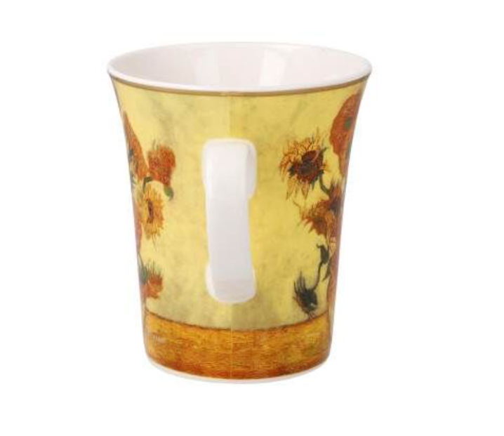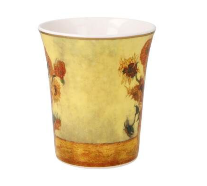 Edle Künstlertasse aus feinem Fine Bone China mit dem berühmten Motiv „Sonnenblumen“ von Vincent van Gogh. Die Tasse besticht durch ihre Leichtigkeit, brillanten Farben und eine aufwändige Echtgoldauflage, die dem Kunstwerk eine besondere Tiefe verleiht.