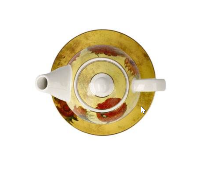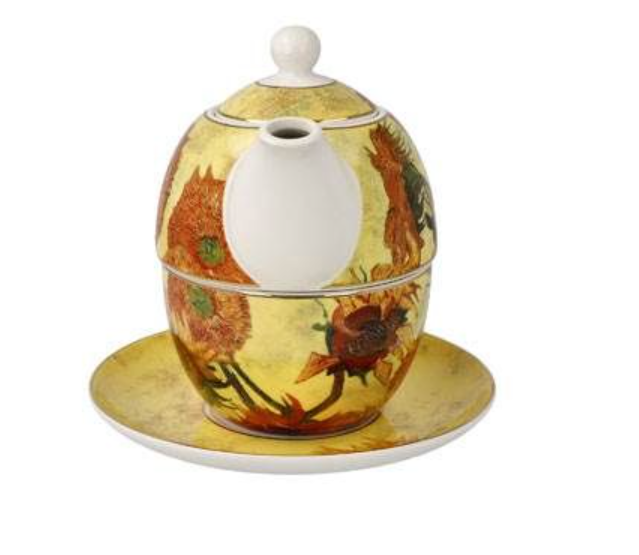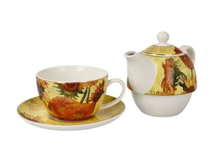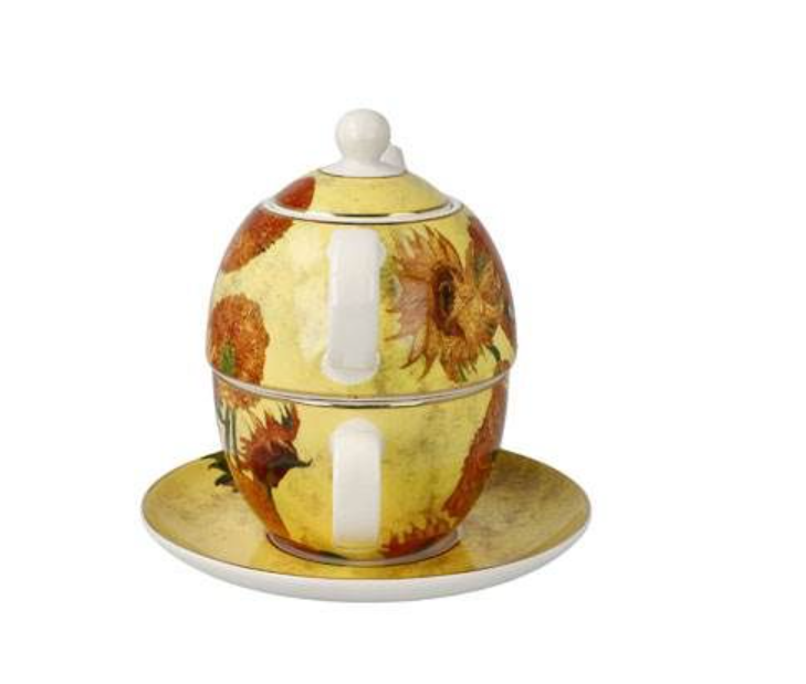 Multifunktionales Tea-for-One Set bestehend aus Teekanne, Tasse und passender Untertasse mit dem weltberühmten Motiv „Sonnenblumen“ von Vincent van Gogh. Die Tasse ist platzsparend in die Kanne integriert – ideal für die schnelle und stilvolle Zubereitung einer einzelnen Portion Tee.