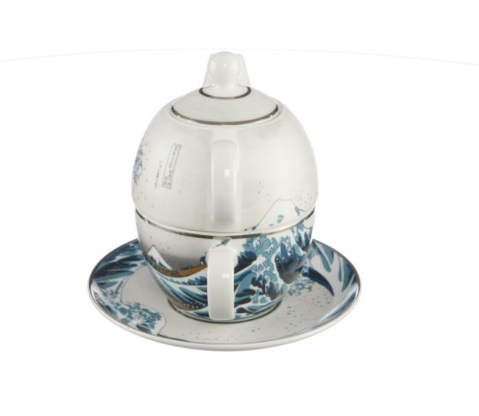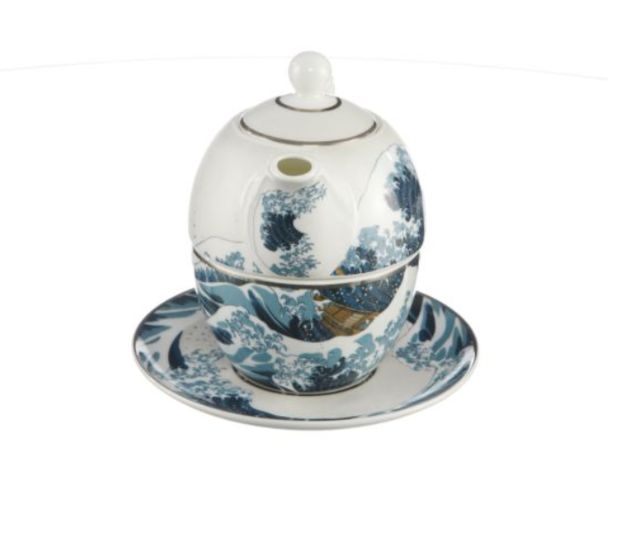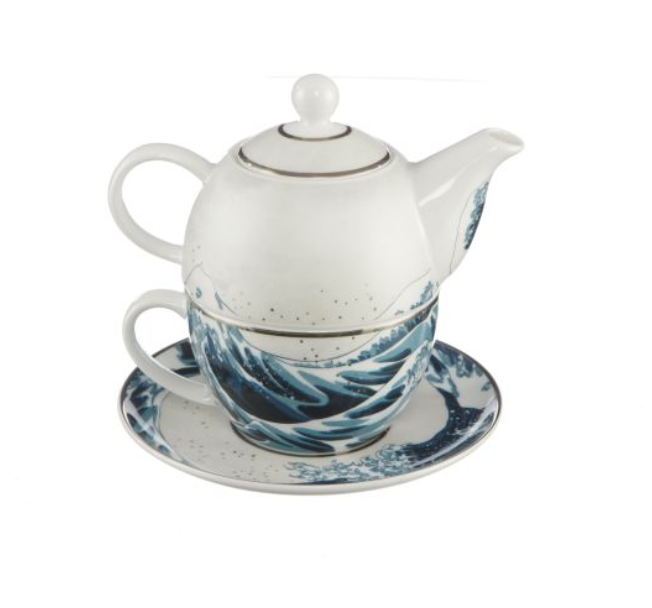 Elegantes Tea-for-One Set aus feinem Fine Bone China mit dem berühmten Motiv „Die große Welle vor Kanagawa“ von Hokusai. Bestehend aus Teekanne, Tasse und Untertasse, ideal für eine Portion Tee. Die Tasse ist platzsparend in die Kanne integriert.