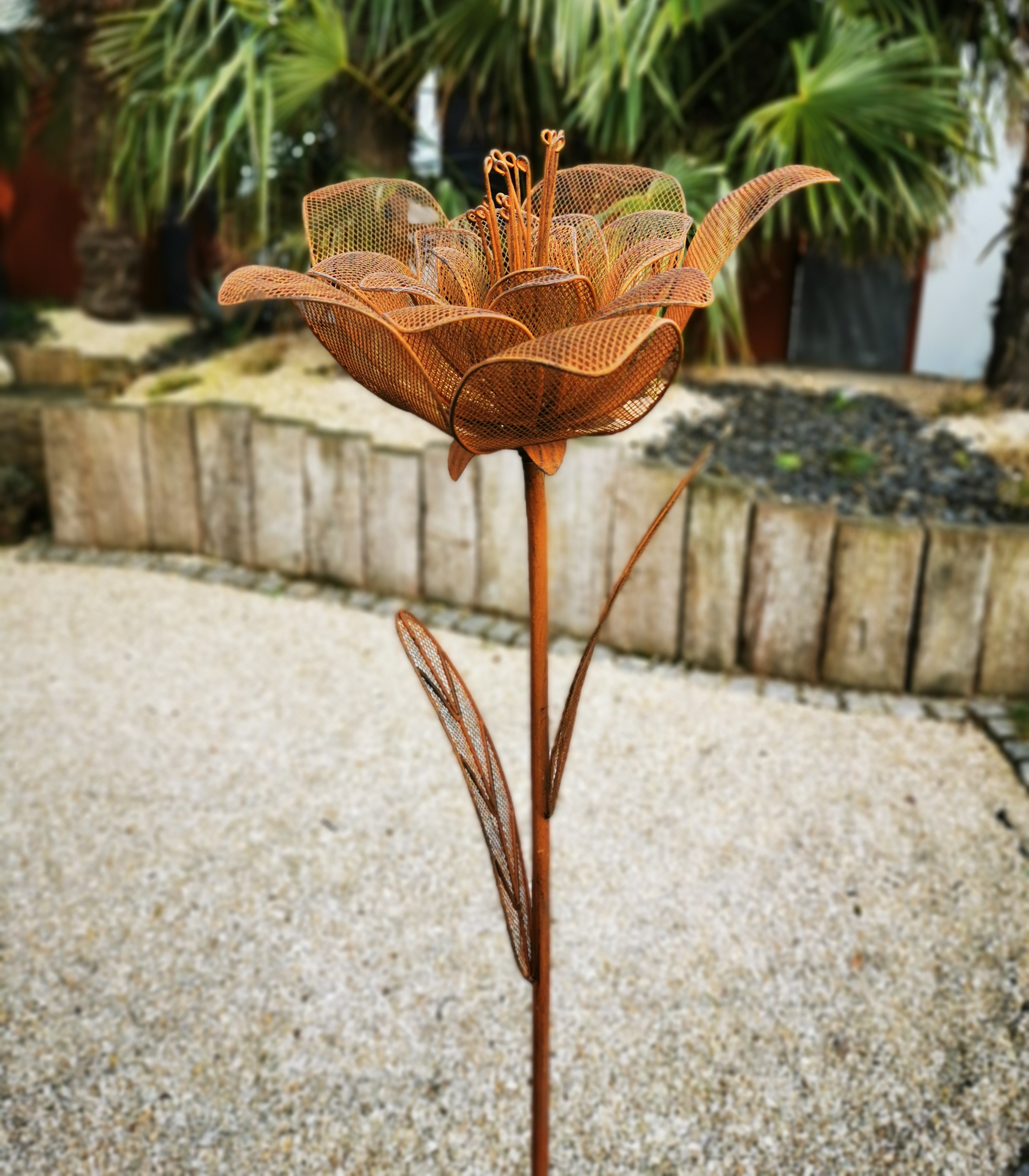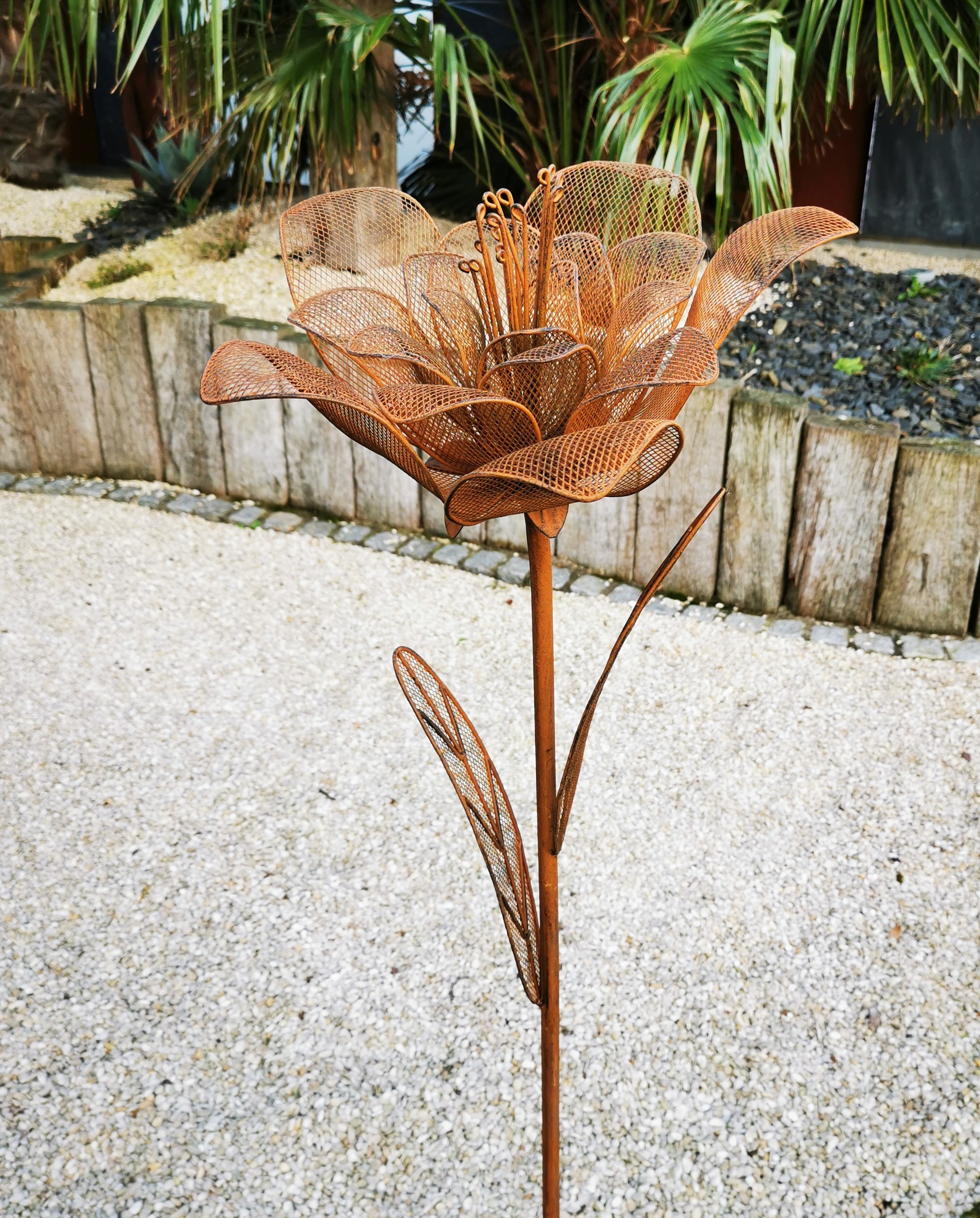 Dank des stabilen Steckstabs lässt sich die wetterfeste Dekoblume mühelos in Beete, Pflanzkübel oder Rasenflächen integrieren. Ob als einzelnes Deko-Element oder in Kombination mit weiteren Gartenfiguren – diese rostige Metallblume sorgt für einen stilvollen Blickfang in jedem Außenbereich.