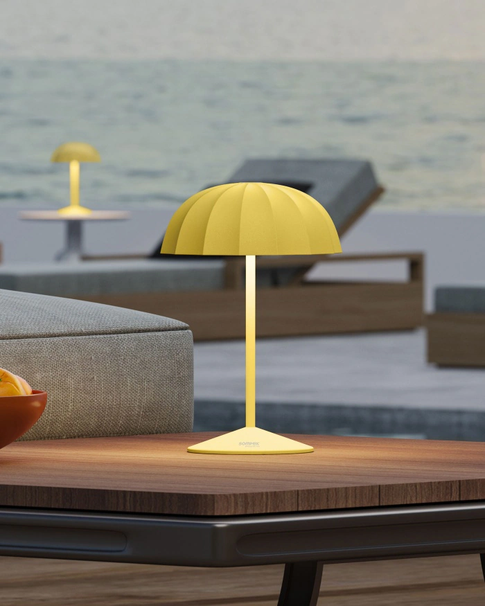 Die OMBRELLINO Akku-Tischleuchte vereint sommerliches Design mit moderner Technik. Die Leuchte in ikonischer Sonnenschirm-Optik sorgt mit einem leistungsstarken Akku für bis zu 78 Stunden kabelloses Licht – ideal für den Innen- und Außenbereich.