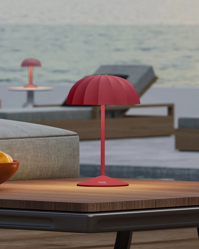 Die OMBRELLINO Akku-Tischleuchte vereint sommerliches Design mit moderner Technik. Die Leuchte in ikonischer Sonnenschirm-Optik sorgt mit einem leistungsstarken Akku für bis zu 78 Stunden kabelloses Licht – ideal für den Innen- und Außenbereich.