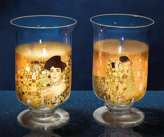 Diese hochwertigen Windlichter aus mundgeblasenem Glas mit den Klimt-Motiven "Adele Bloch-Bauer" und "Der Kuss" können auch sehr dekorativ als Vase genutzt werden.