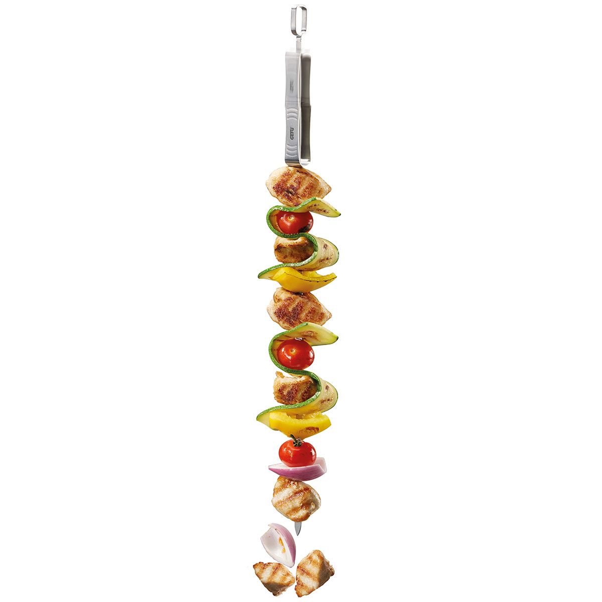 Marinierte Bauchspeckstreifen, Filetstücke oder Gemüsescheiben lassen sich mit den 45 cm langen Grillspießen aus hochwertigem Edelstahl bequem auf dem Grill wenden – und durch den integrierten Abstreifer landet das Grillgut im Nu auf dem Teller.