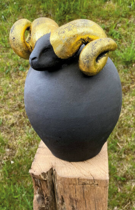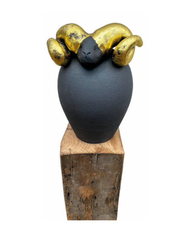 Handmodellierter Widder aus schwarzem Ton auf einer 200 Jahre alten Eichenstele mit Zapfenlöchern.