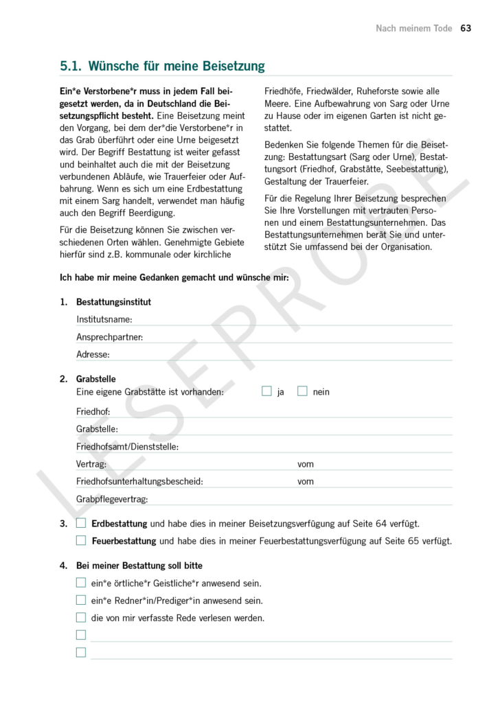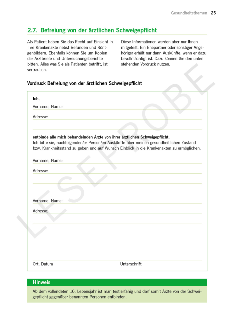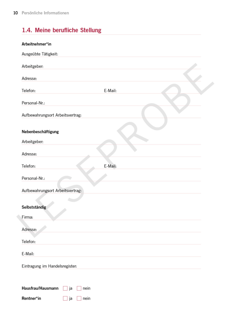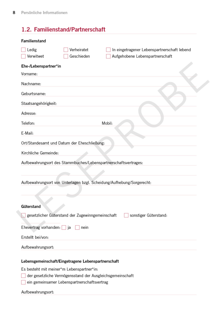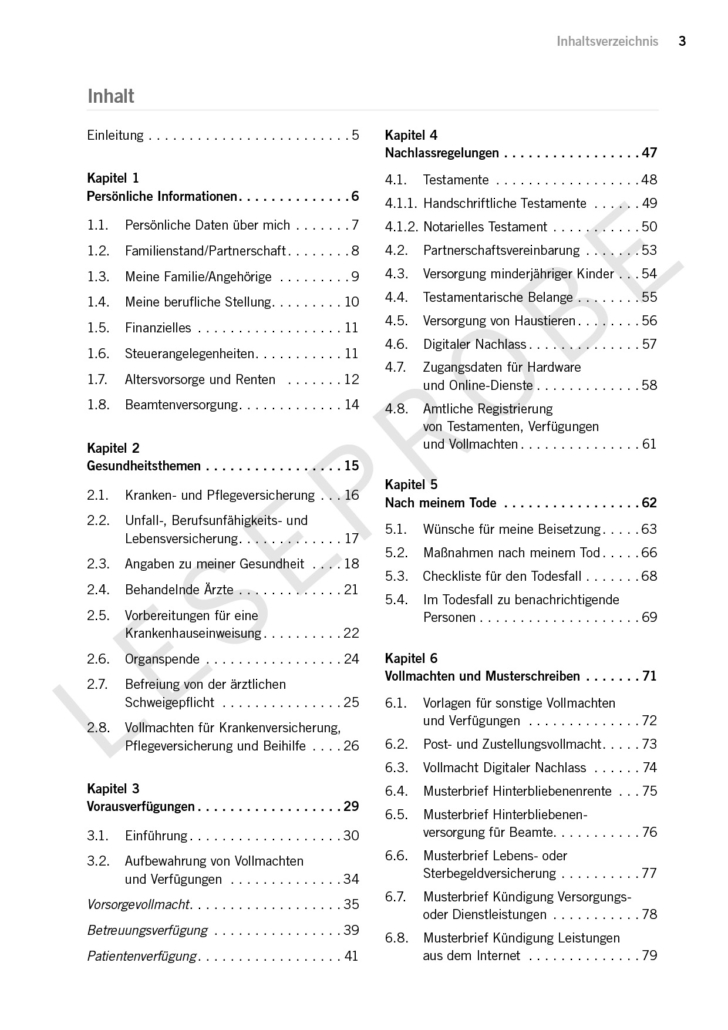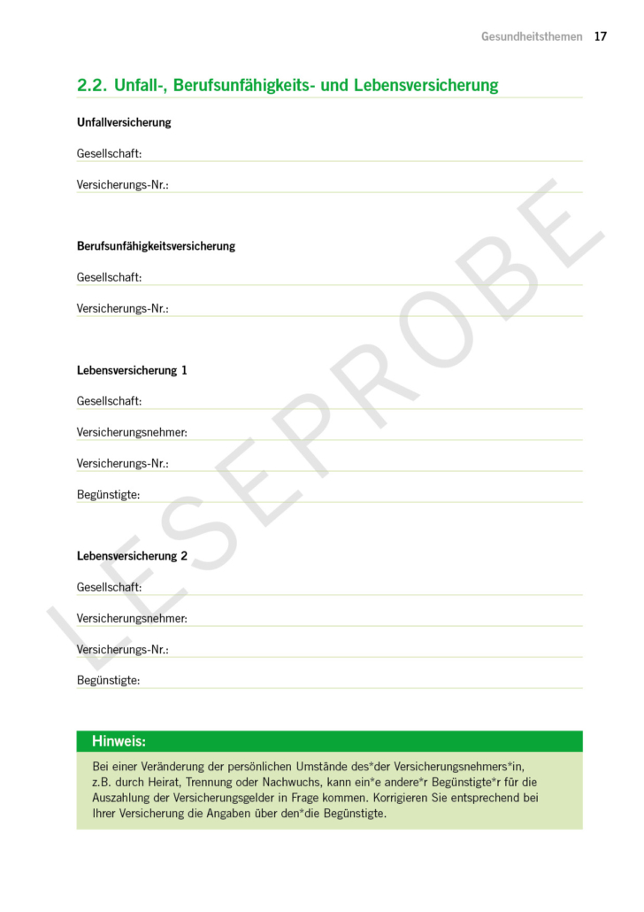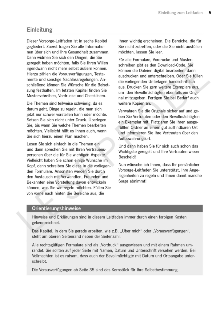 Auf 100 Seiten erhältst du einen Leitfaden für alle Vorsorgethemen. Der Leitfaden dient auch als Dokumentensammlung.