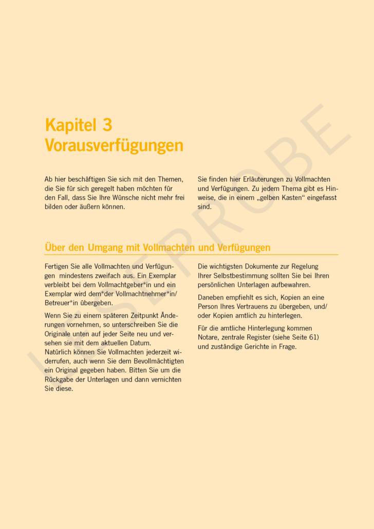 Der kompakte Leitfaden „Vorsorge – geregelt!“ unterstützt dabei, Ordnung in deine Unterlagen zu bringen und sich mit den heute nötigen Vollmachten und Verfügungen auf schwierige Lebenssituationen rechtsverbindlich vorzubereiten.