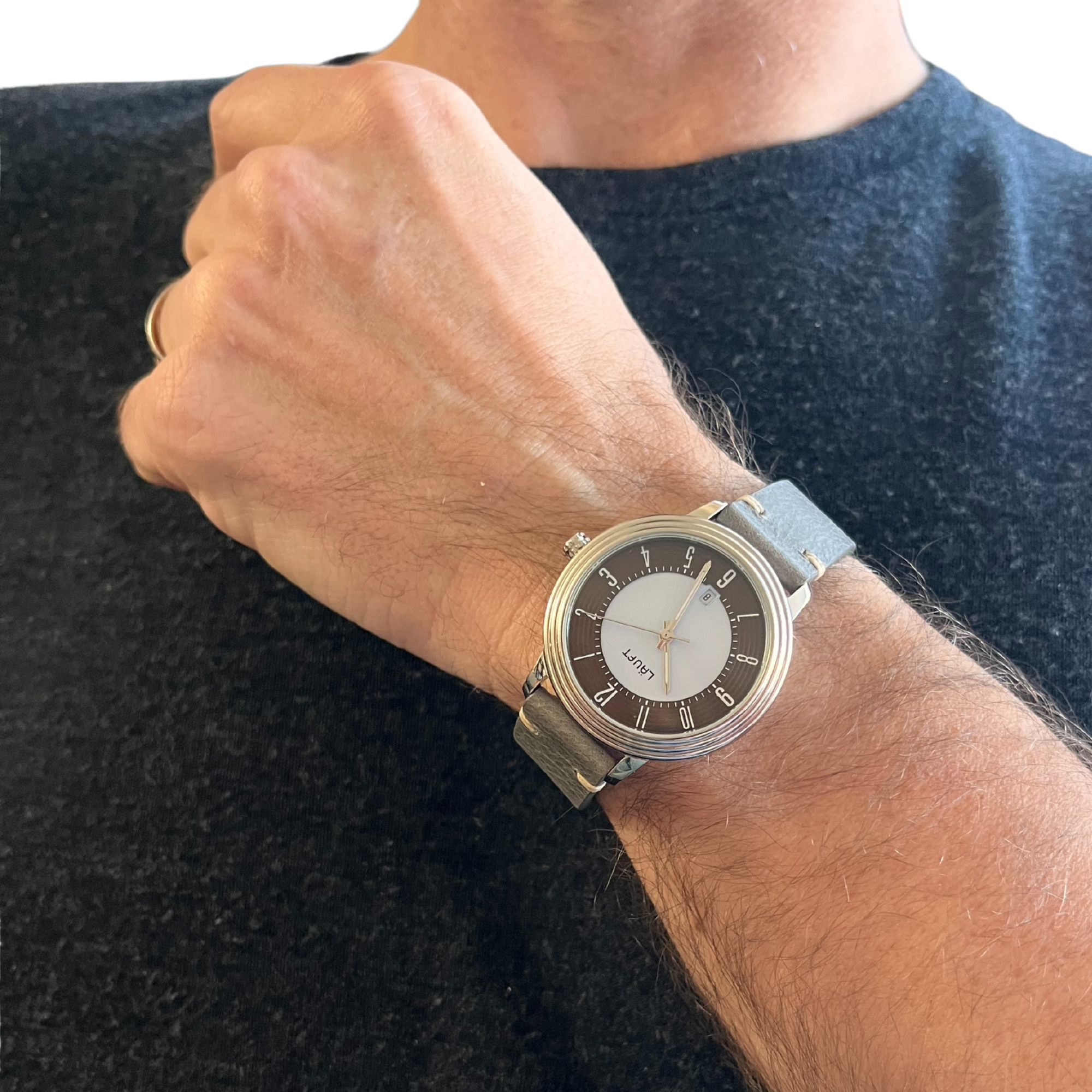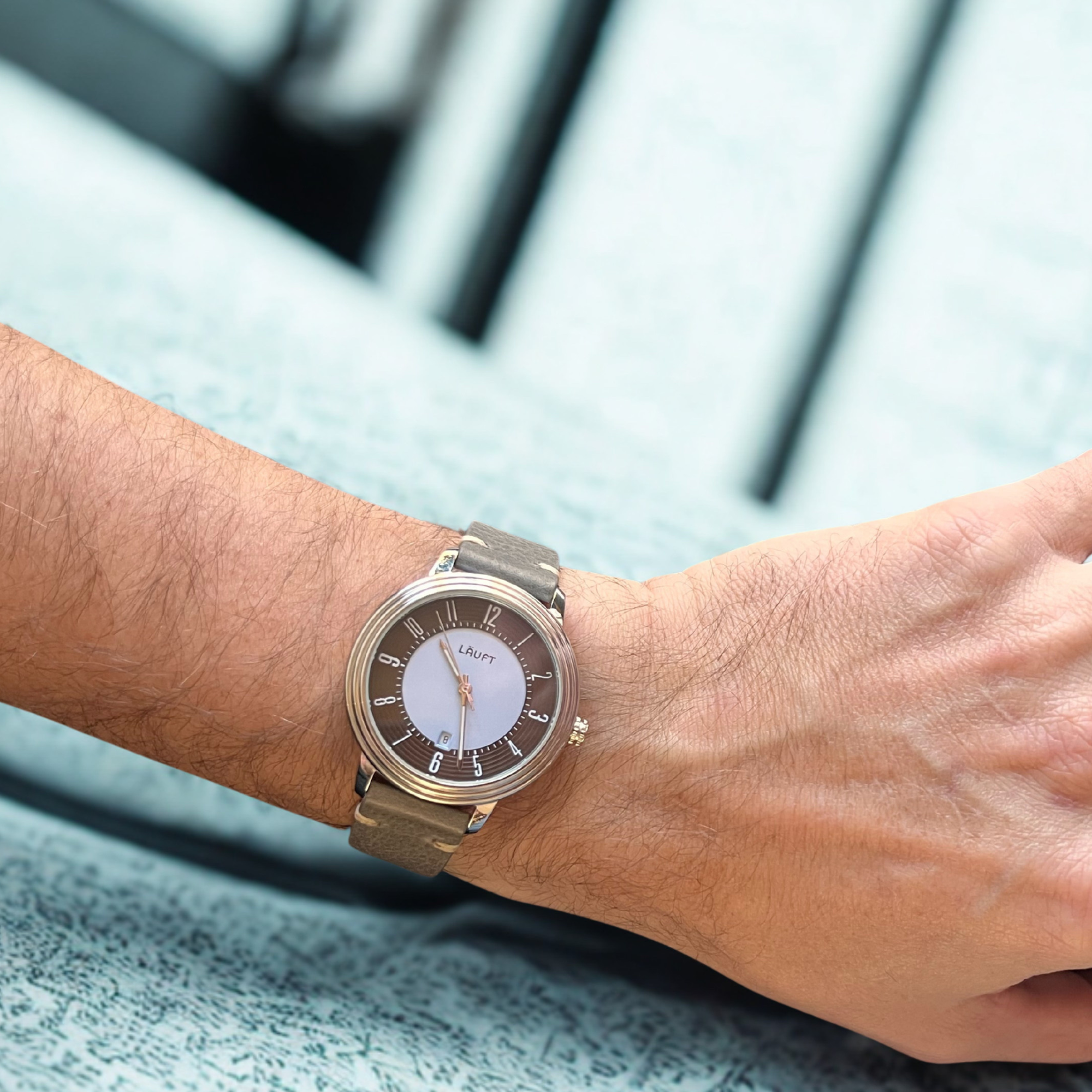 Die „Läuft“-Armbanduhr kombiniert klassisches Design mit zuverlässiger Technik und hochwertiger Verarbeitung. Ihr markantes Zifferblatt in Hellblau mit braunem Ring wird von einem fein gerillten Edelstahlgehäuse eingefasst und verleiht der Uhr eine besondere optische Tiefe. Im Inneren sorgt das präzise Quarzwerk Miyota 2105 für eine verlässliche Zeitanzeige – inklusive Datumsfunktion auf sechs Uhr.