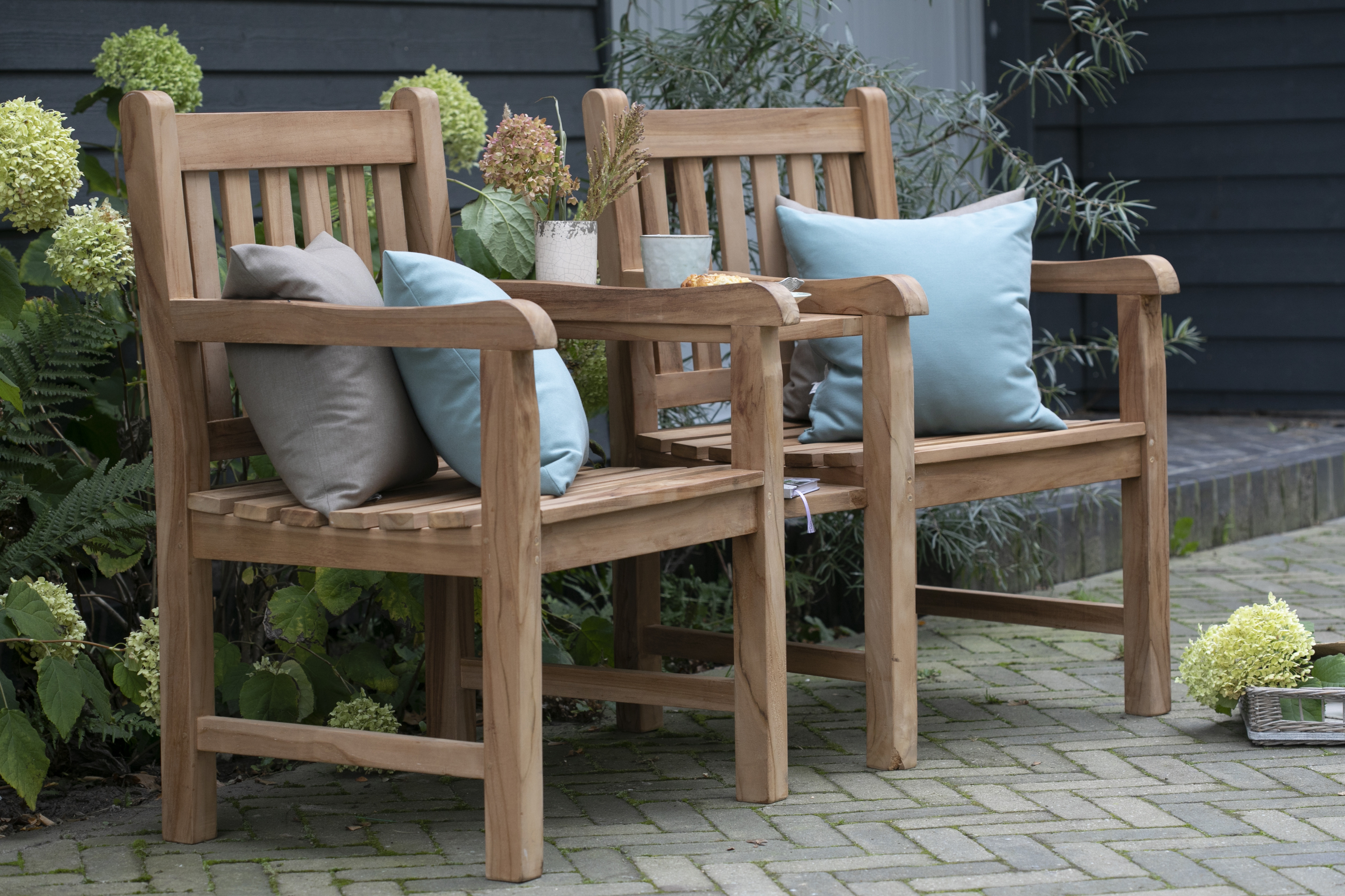 Die Teak Bank als Doppelsitzer aus naturbelassenem Massivholz ist dank der robusten Materialqualität optimal witterungsbeständig und verleiht jedem Außenbereich ein gemütliches Ambiente.