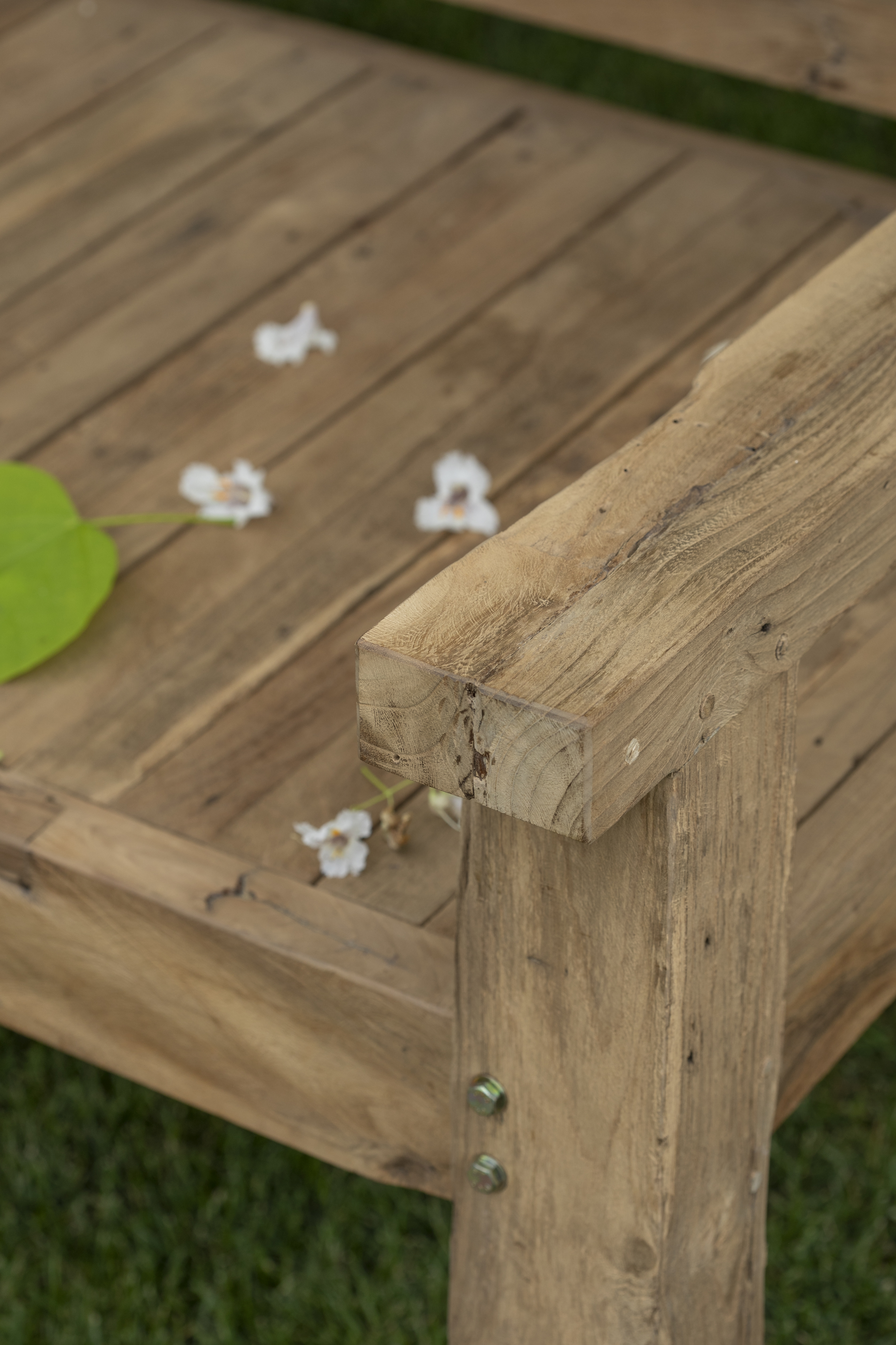 Die Teak Gartenbank Rustique aus naturbelassenem Massivholz ist dank der robusten Materialqualität optimal witterungsbeständig und verleiht jedem Außenbereich ein interessantes Ambiente.