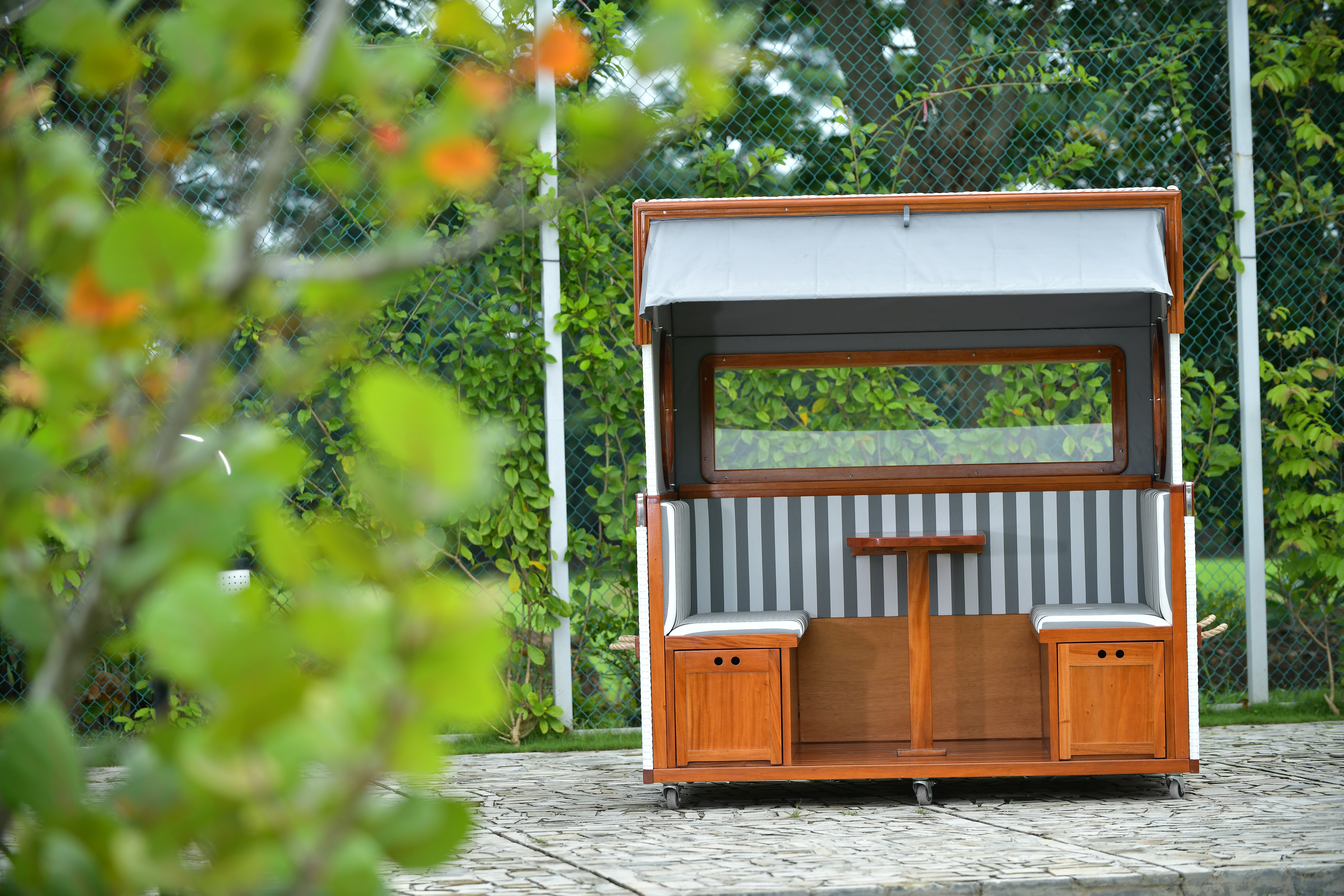 Der Strandkorb Gosch-Lounge eignet sich hervorragend für den Einsatz in der Gastronomie oder im Biergarten. Der hohe Sitzkomfort und das ansprechende Design macht ihn zu einem absoluten Blickfang. Dank des großen Tisches und der gegenüberliegenden Sitzbänke schafft die Lounge eine einladende Atmosphäre, ideal für gesellige Runden und Bierzelt-Gaudis.