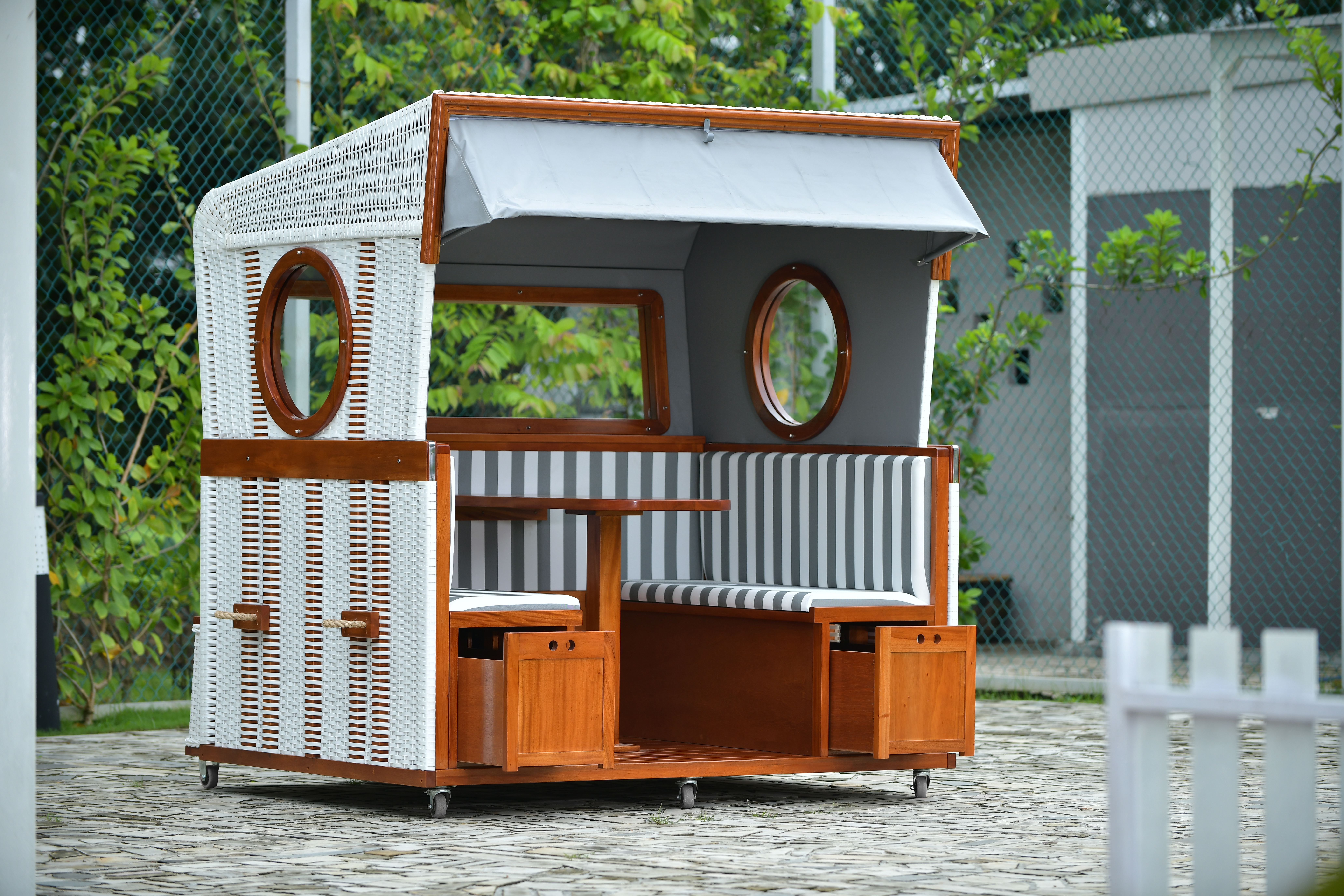 Zusätzlichen Komfort bieten zwei Schubkästen unter den Sitzbänken, die Platz für Getränke oder Zubehör wie Decken und Kissen bieten. Ein Stromanschluss ermöglicht es, Musik zu hören oder elektronische Geräte aufzuladen. Die zwei Sitzbänke bieten ausreichend Platz für gemütliches Beisammensein mit Freunden oder Familie, während der große Bistrotisch in der Mitte genügend Platz für Getränke und Speisen bereithält. Eine praktische Sonnenmarkise schützt vor zu viel Sonne und sorgt für angenehmen Schatten.
