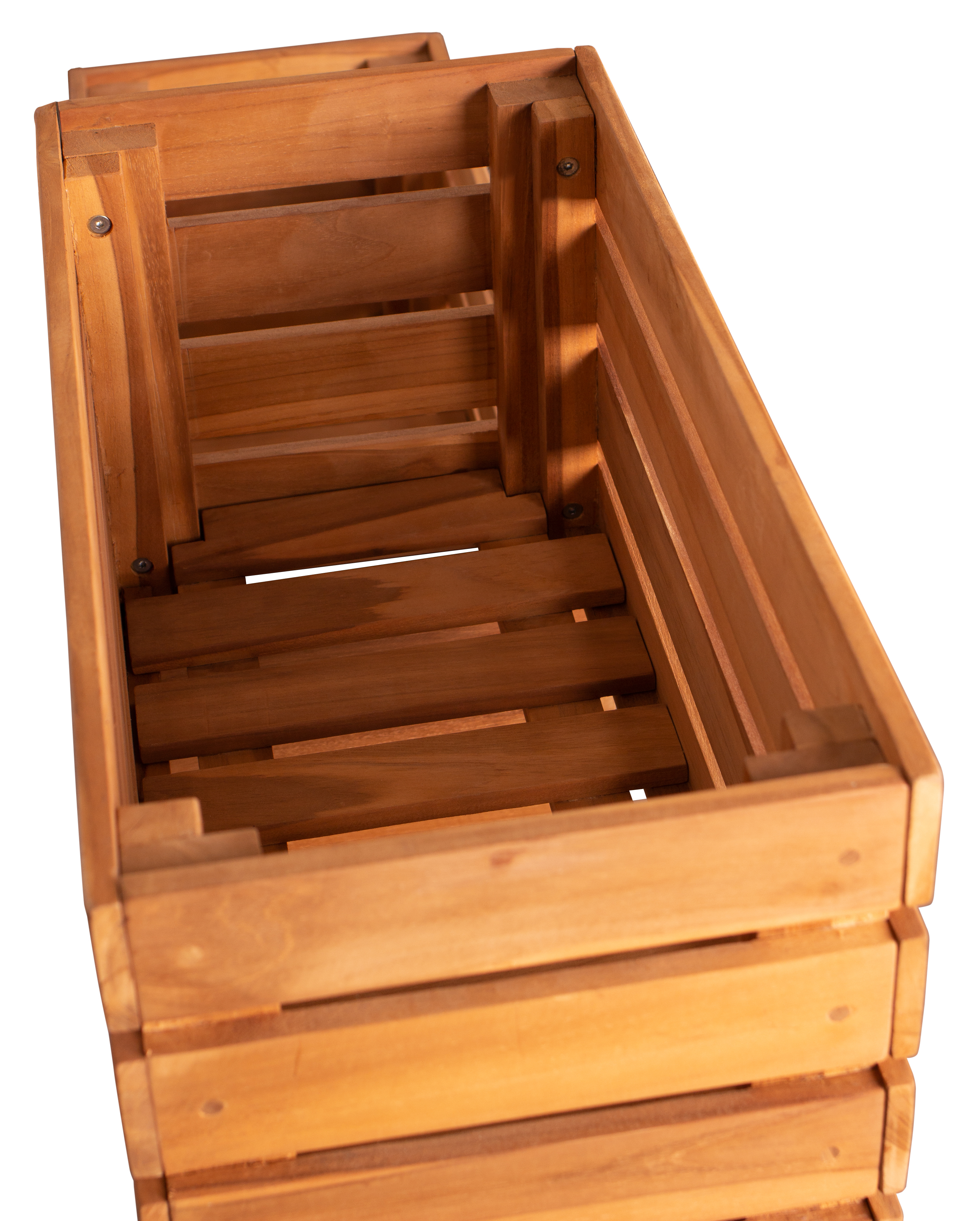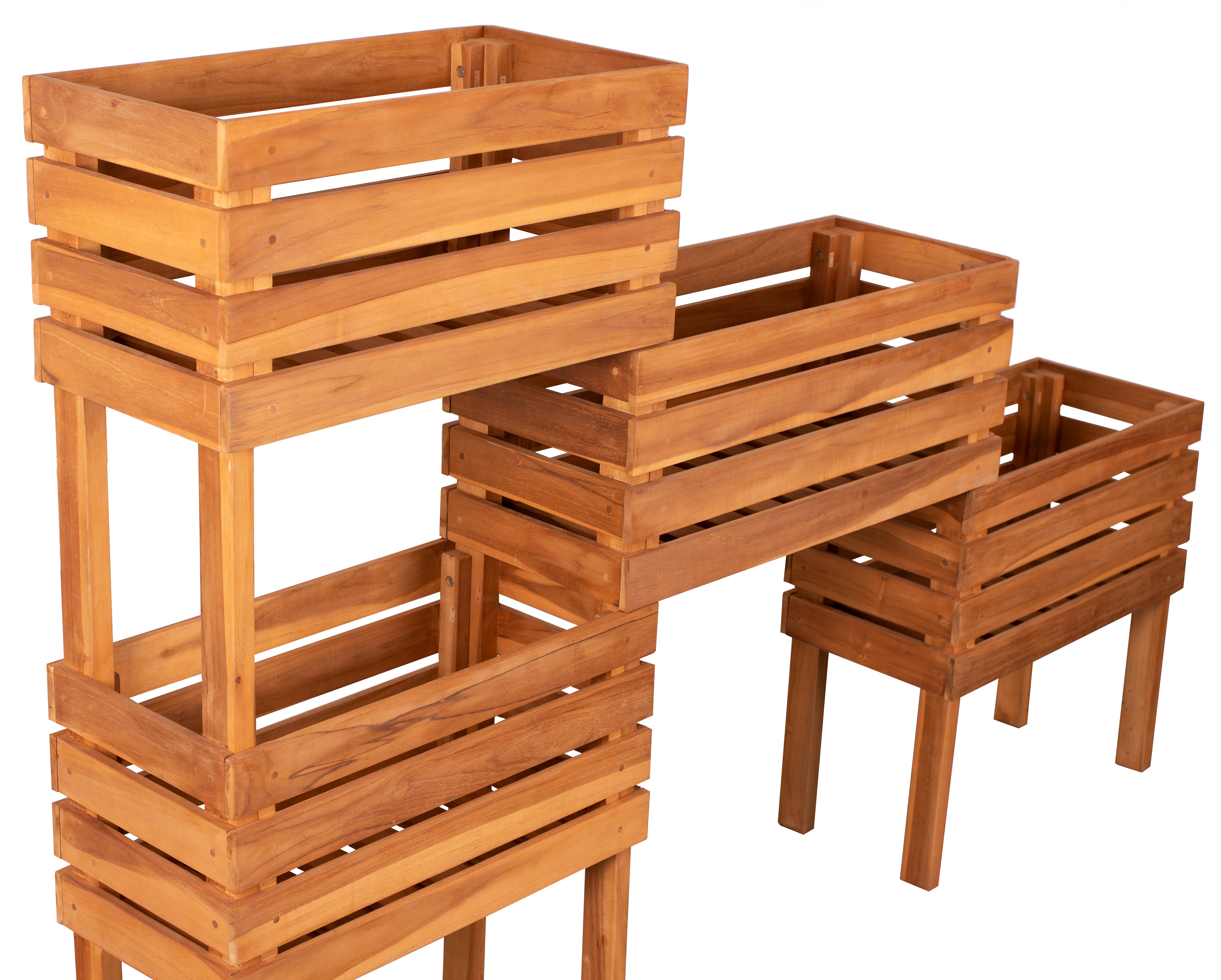 Mit 4 einzelnen Hochbeeten für unterschiedliche Bereiche geeignet, anwendbar z.B. für zauberhafte Gartendekorationen oder natürlich auch in seiner ursprünglichen Bestimmung für Bepflanzung mit unterschiedlichen Gemüse- oder Pflanzenarten. Zu diesem Zweck sind die Pflanzgefässe mit Folie ausgeschlagen, aber es kann auch ohne Folie verwendet werden. Das Hochbeet aus Vollholz Teak ist vielseitig kombinierbar und bildet eine elegante Aufwertung zur Gartenstruktur durch seine robuste Optik.